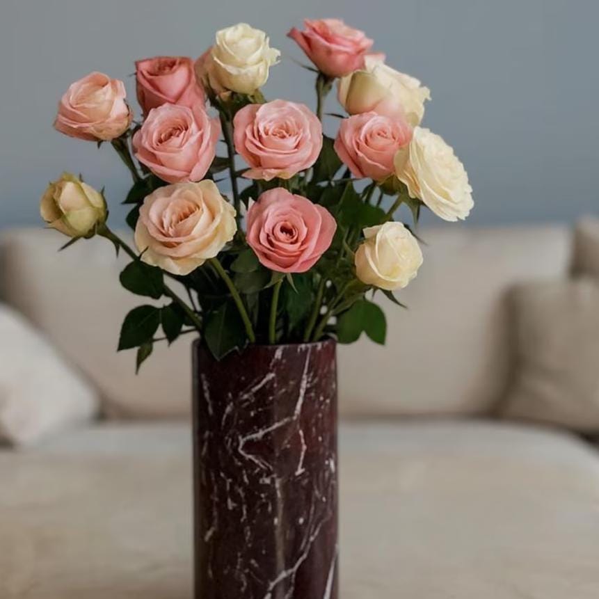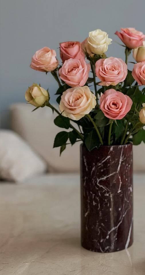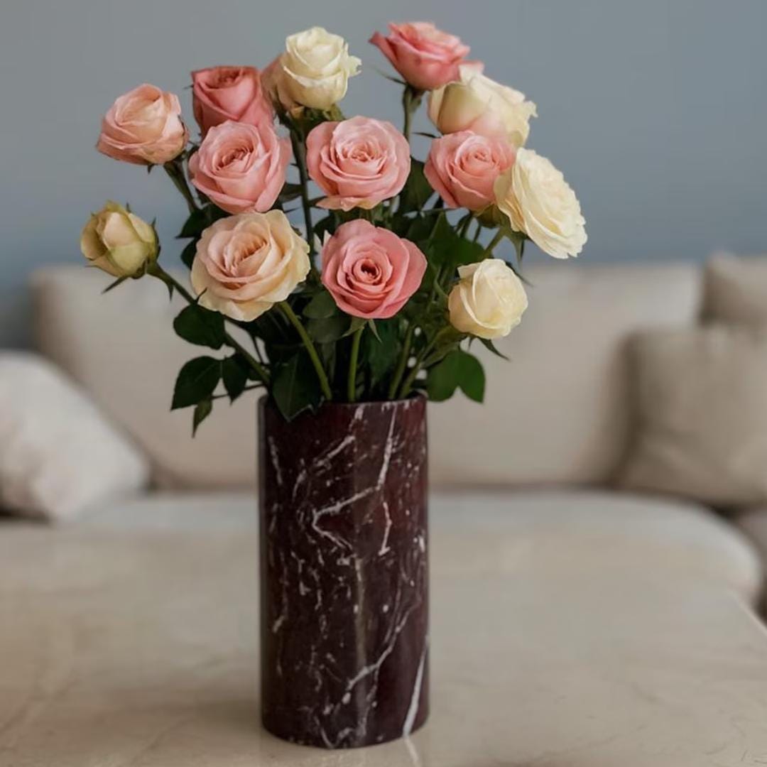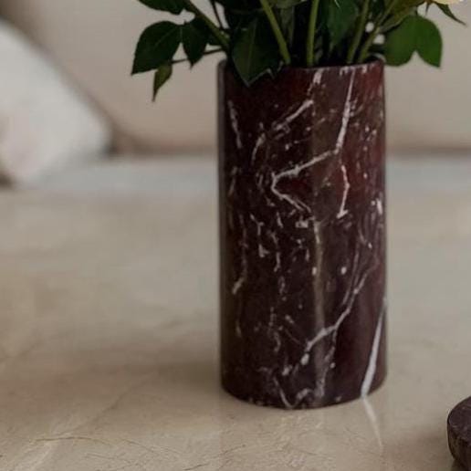 Elevate your home décor with this elegant set crafted from luxurious Rosso Levanto marble, a rare Italian stone known for its deep burgundy-red base and striking white veining. The tall cylindrical vase beautifully complements fresh or artificial flowers, while the round marble base with a silver deer figurine adds a refined artistic touch.