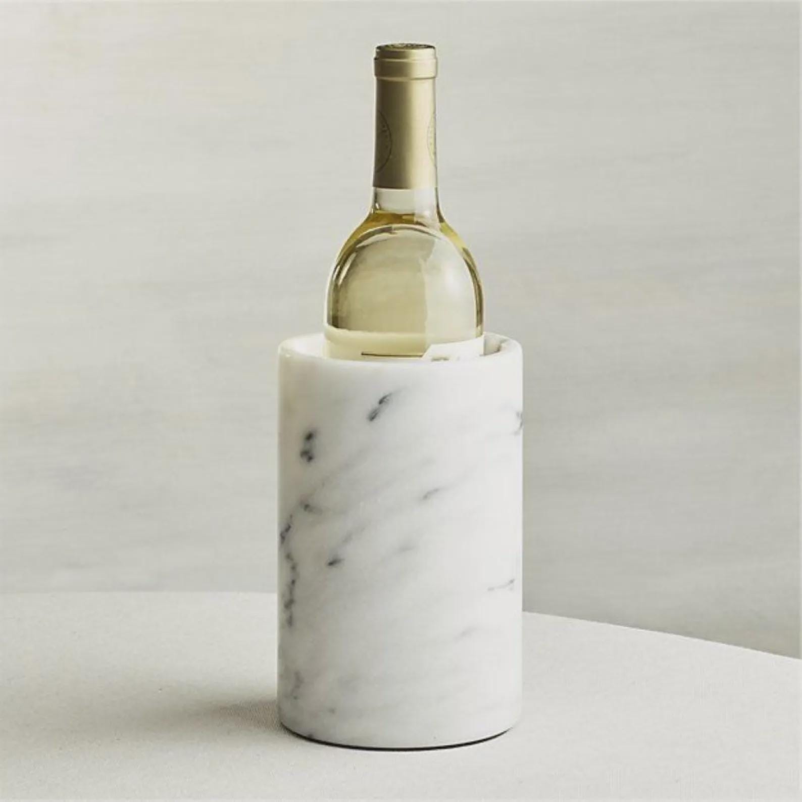 Bring timeless luxury to your bar cart or dining table with this handcrafted white marble wine chiller. Carved from a single piece of natural marble, its clean cylindrical silhouette and soft grey veins create a refined statement that cools your bottle while elevating the look of your home bar, dining room, or entertaining space