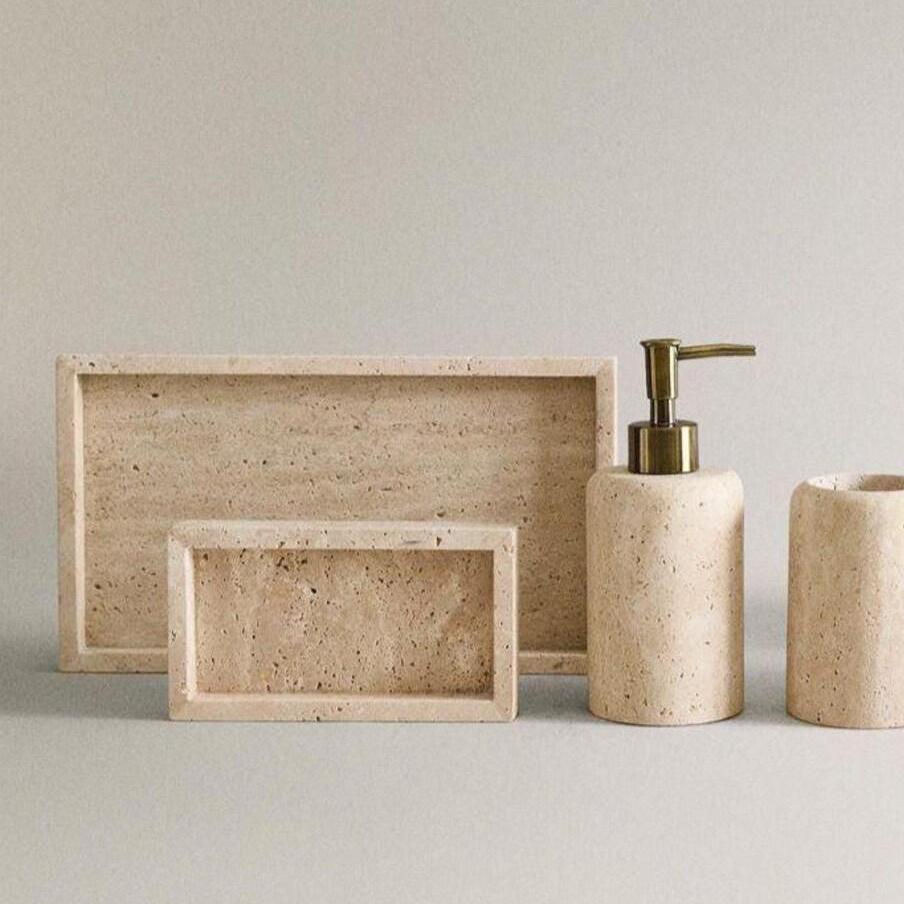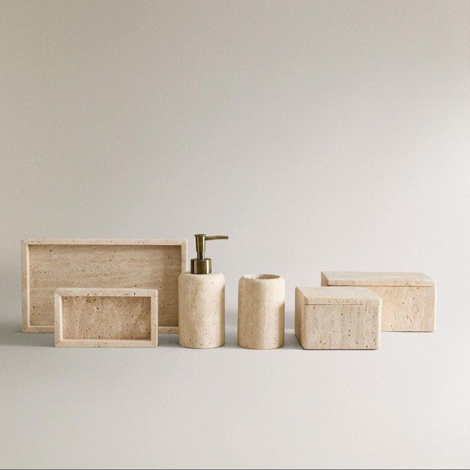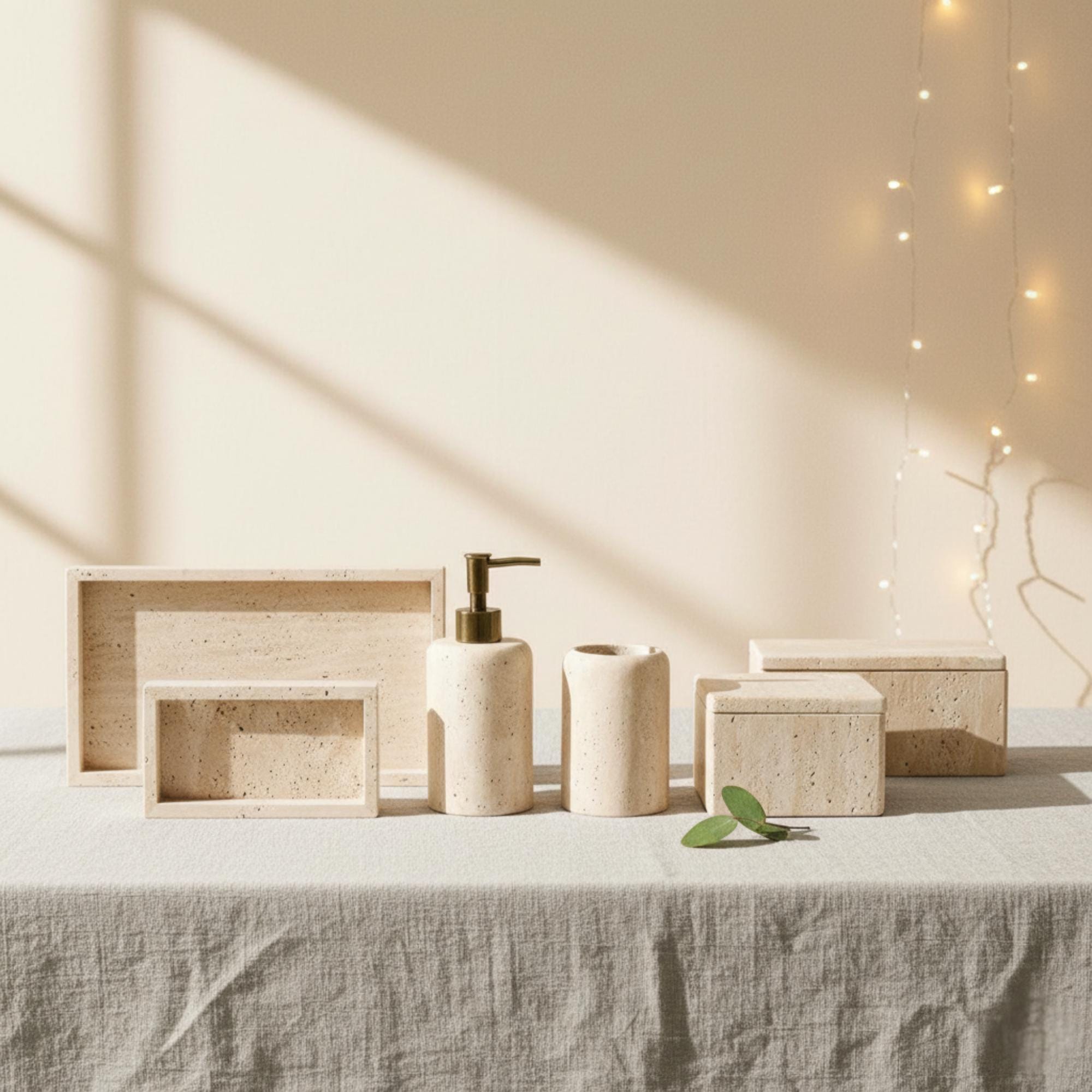 Elevate your everyday rituals with the timeless beauty of this artisanal travertine bathroom set, meticulously
