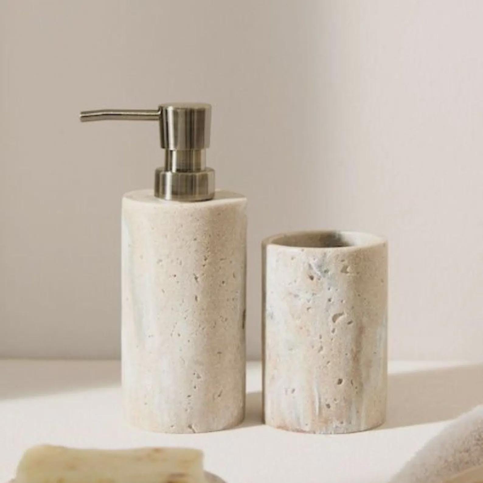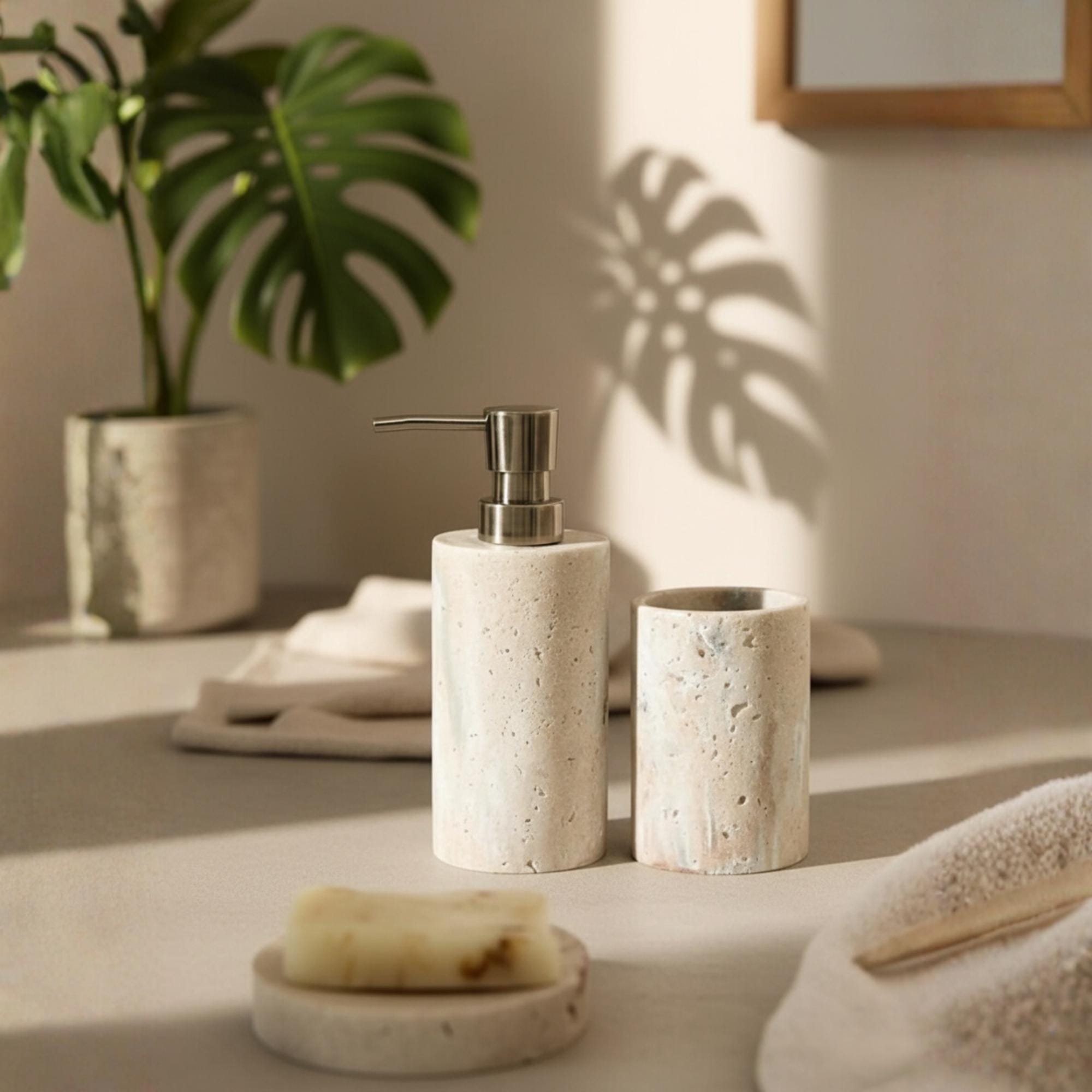 Handcrafted Travertine Bathroom Set – Soap Dispenser & Tumbler by GraniteGrace