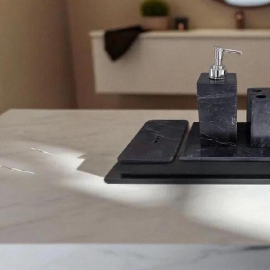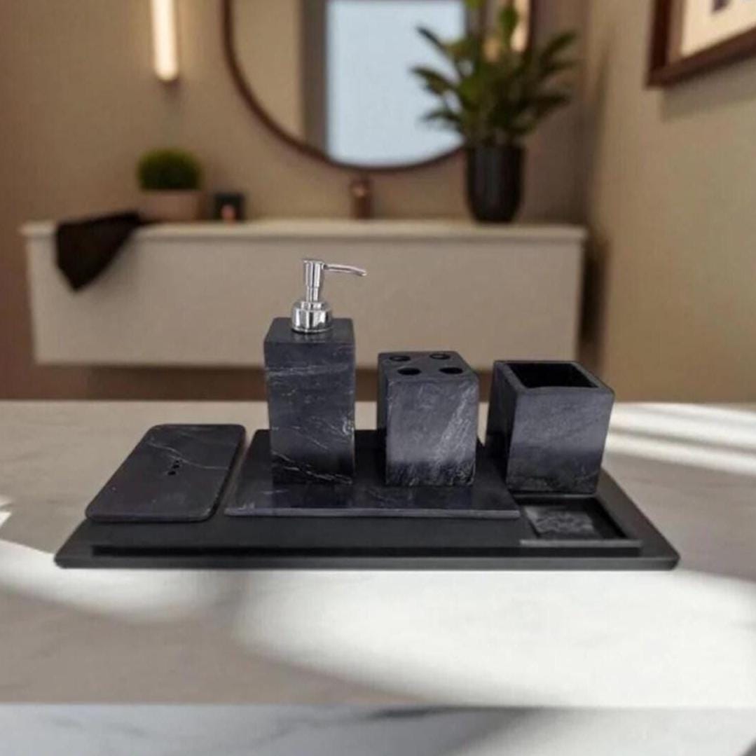 Each piece showcases the deep, rich tones and subtle veining of natural black marble—unique in every set. The collection includes a soap dispenser, toothbrush holder, tumbler, and a coordinating tray, designed to keep your countertop organized while elevating your space with natural sophistication.