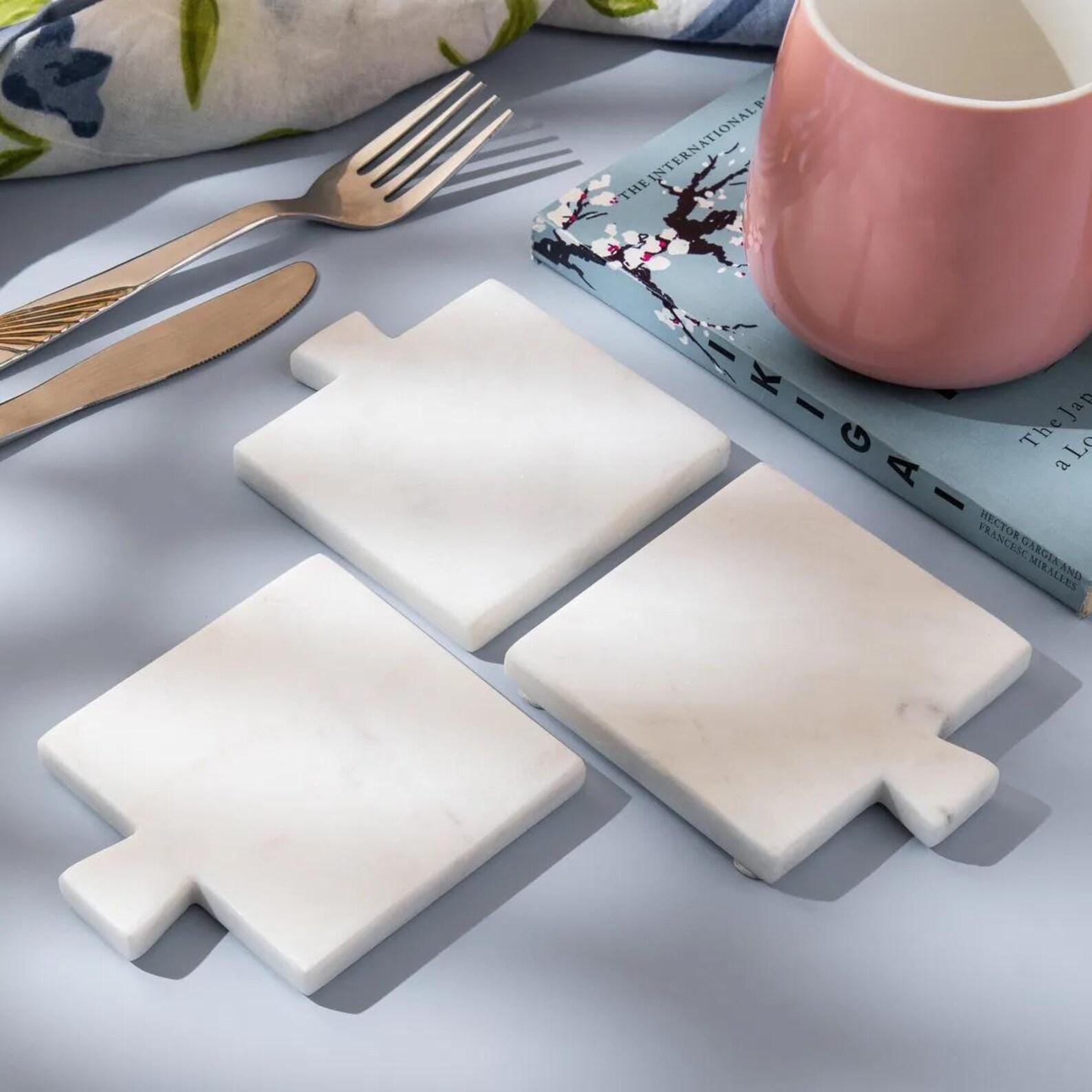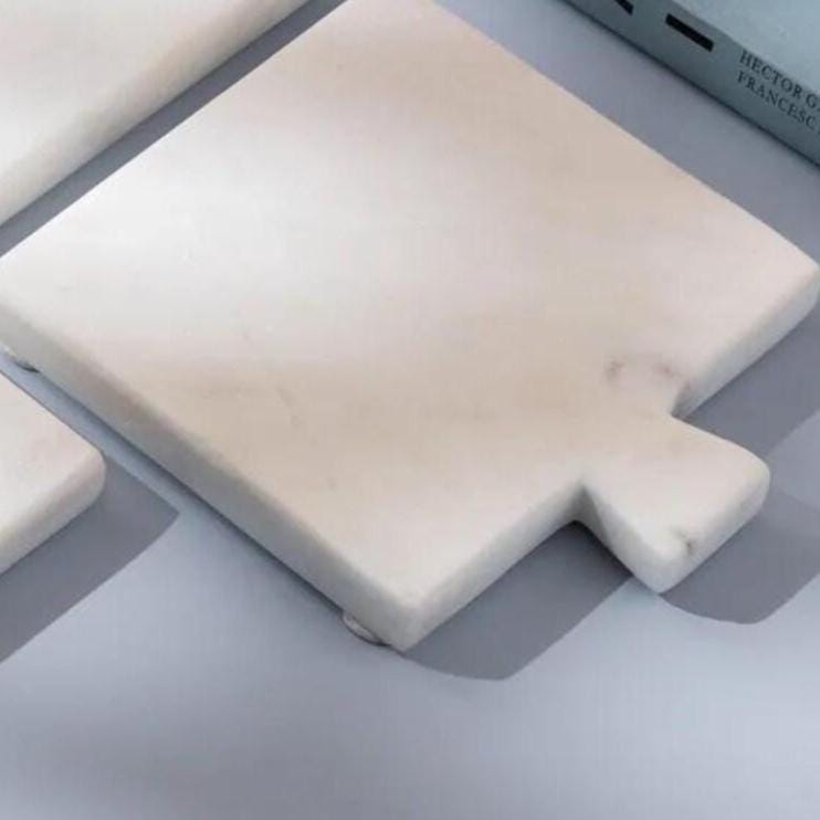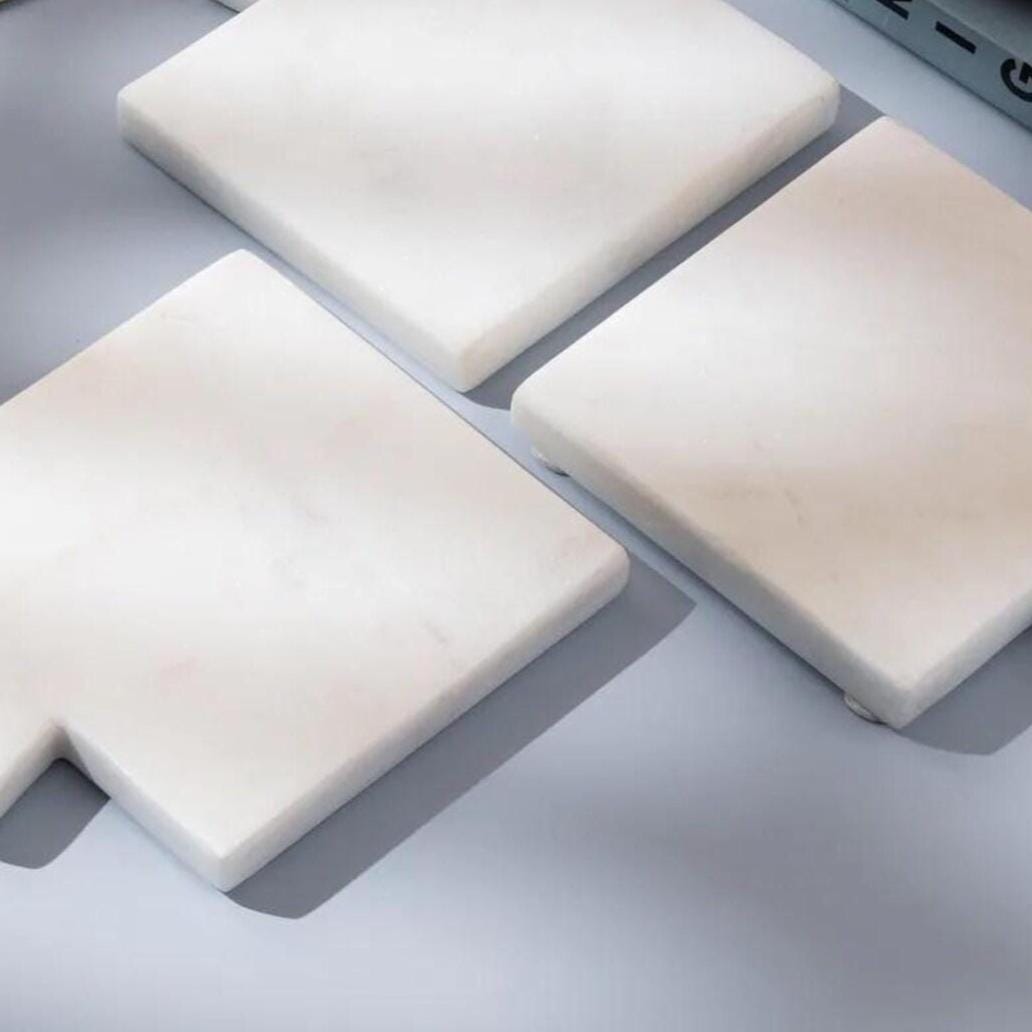 Add a touch of timeless sophistication to your table with this set of handcrafted white marble coasters. Designed in a sleek square shape with a subtle tab handle, each piece brings a modern, minimalist charm to your home decor.