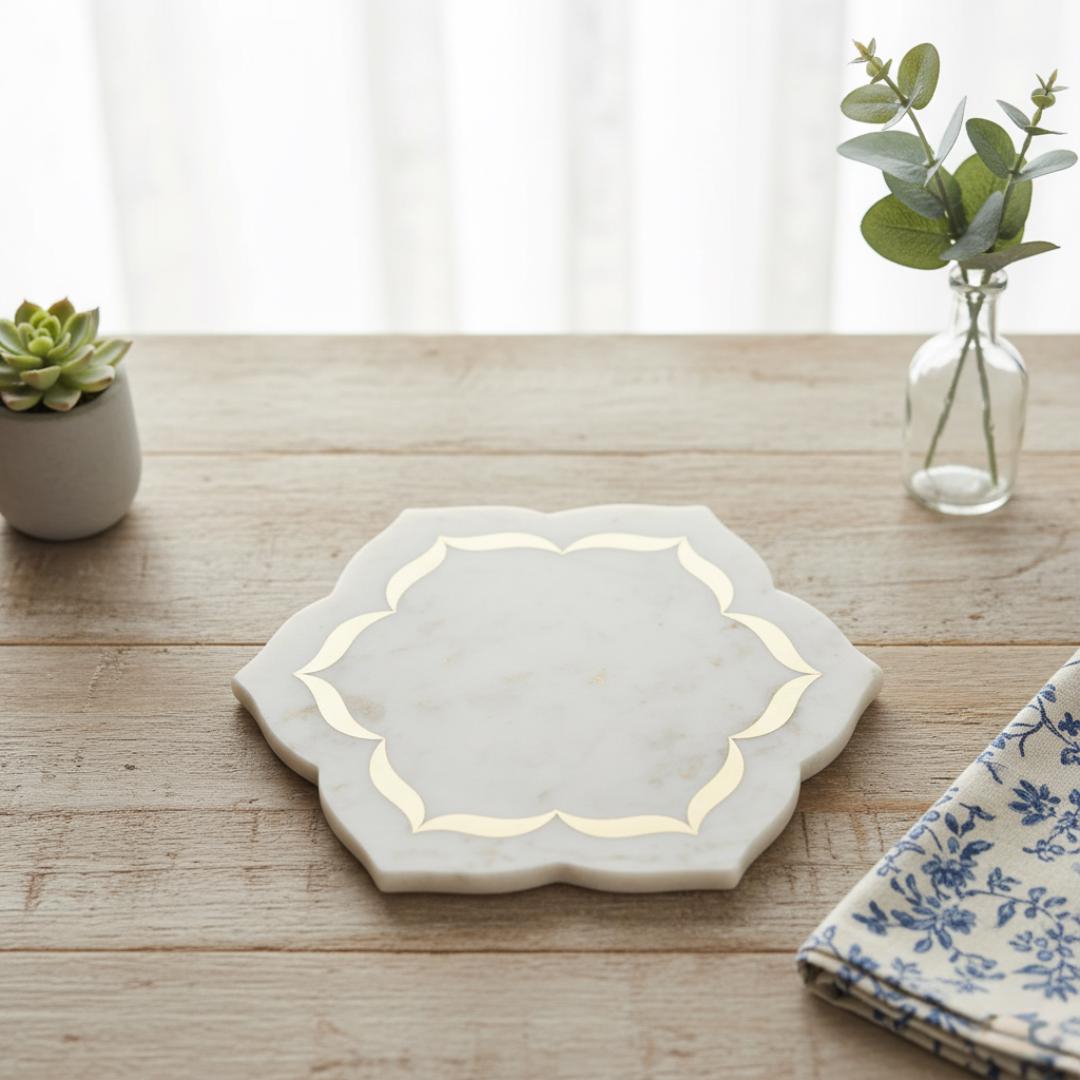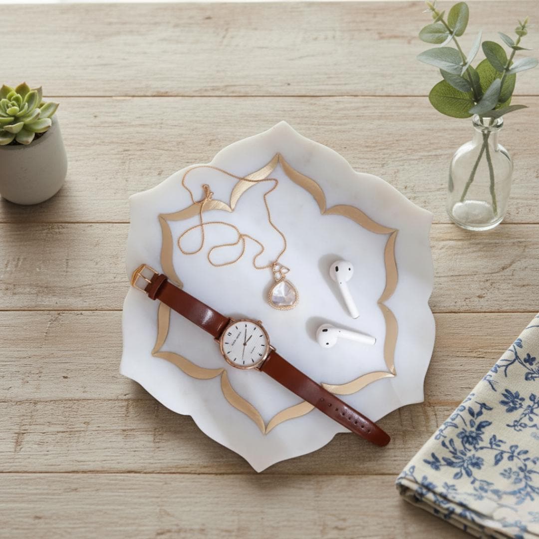 Experience refined craftsmanship with this handmade white marble tray, accented with a delicate gold inlay pattern. Designed to elevate your space, this versatile piece serves beautifully as a jewelry organizer, vanity display, or coffee table accent. Each tray is meticulously polished to highlight the natural veining of marble, giving every piece a unique character and timeless appeal. Its smooth, glossy surface and minimalist silhouette bring an aura of modern luxury to any room. Whether you’re styling a bedroom dresser, an entryway console, or a spa bathroom, this marble tray adds an effortless sense of balance and sophistication.