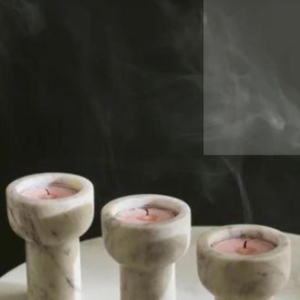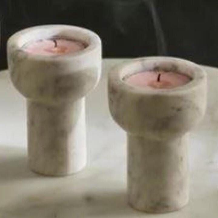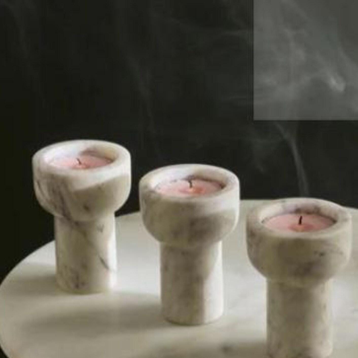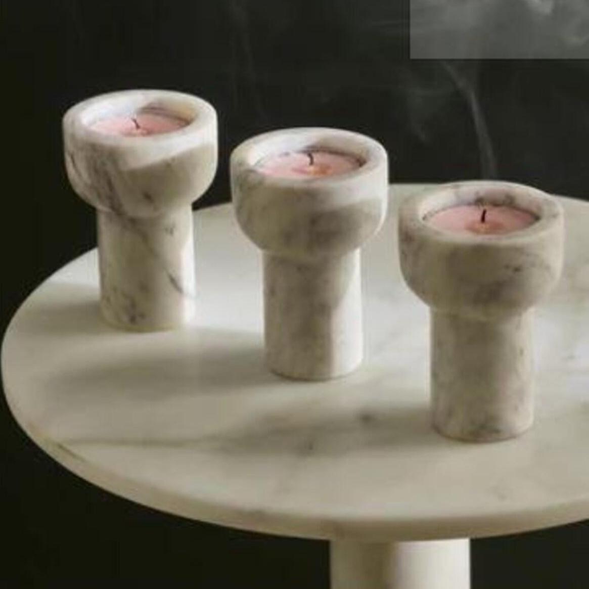 Highlights Ships from a small business in India Materials: Marble Elevate your space with this stunning set of handcrafted white marble tealight holders. Each piece is sculpted from natural stone, showcasing soft grey veining and a smooth, polished finish. The modern pedestal design creates a striking silhouette, adding instant sophistication to coffee tables, shelves, dining setups, or spa-inspired corners.
