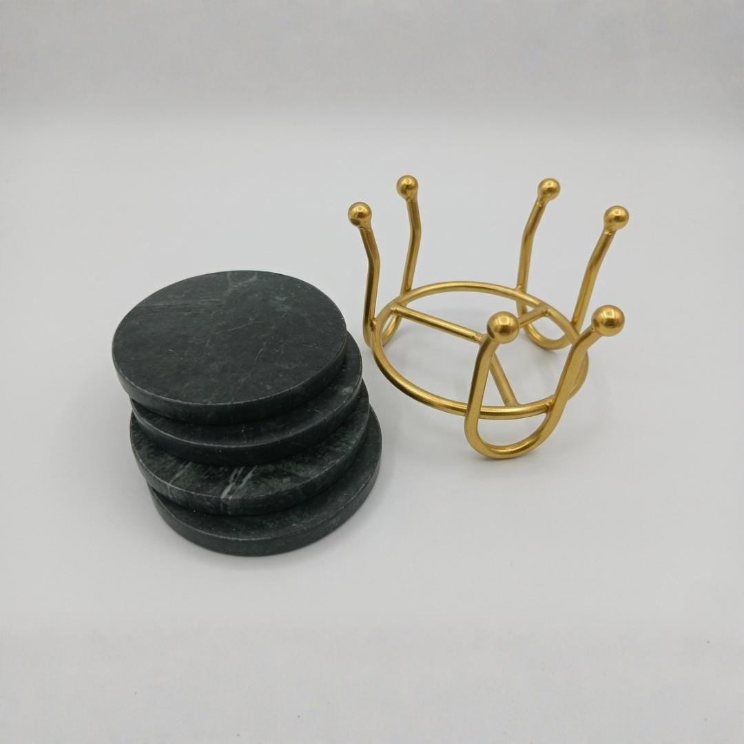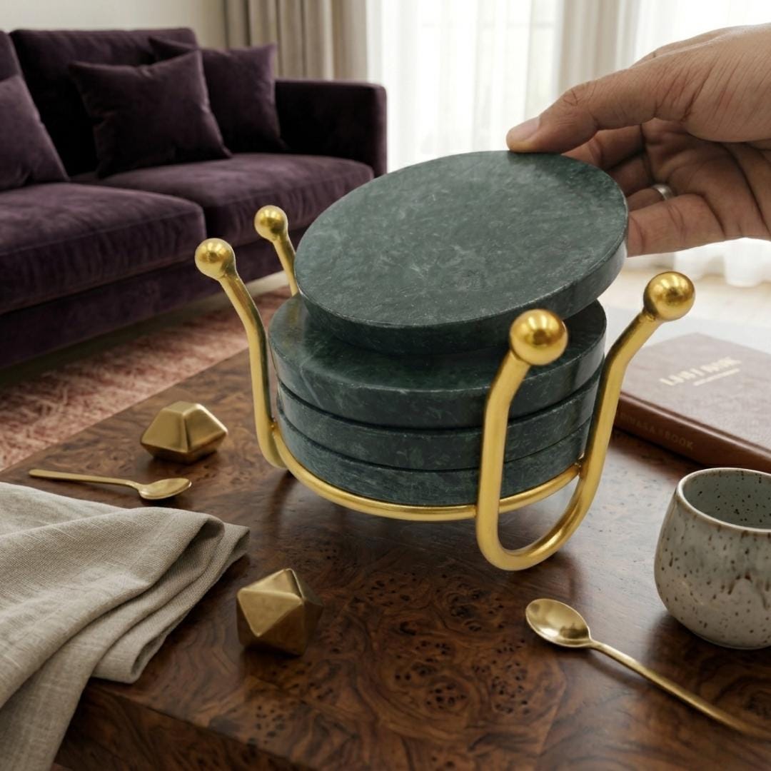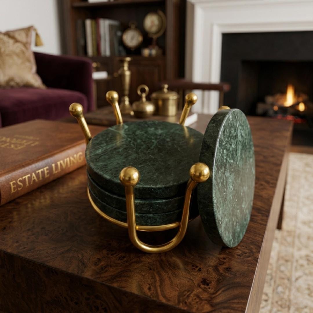 Transform your living space with this Handcrafted Green Marble Coaster Set, a perfect blend of elegance, durability, and luxury home decor styling. Each coaster is carved from premium natural green marble, showcasing rich veining that adds a sophisticated touch to any room. Paired with an antique metal holder, this set becomes a functional yet decorative piece ideal for modern, rustic, or vintage style interiors.