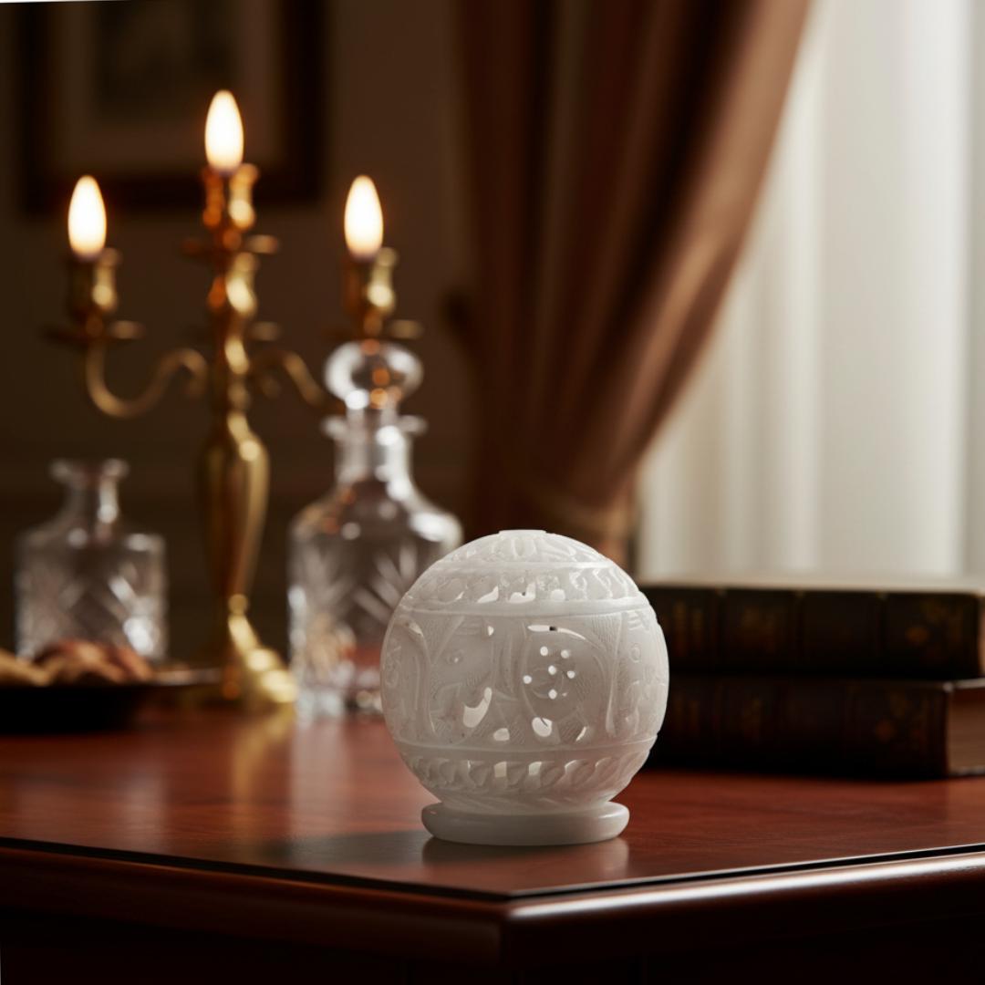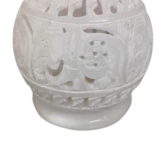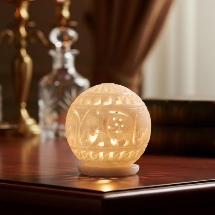Transform any space with this exquisite hand-carved white marble sphere. Each piece is a testament to artisanal skill, meticulously sculpted to showcase a delicate blend of graceful elephant figures and intricate floral patterns. Artisan Craftsmanship: Each sphere is carefully carved from natural white marble, ensuring a unique and timeless piece. Enchanting Glow: When illuminated from within, the detailed carvings come alive, casting a soft, magical light that creates a serene and luxurious atmosphere. Versatile Décor: Perfect as a stunning centerpiece, a sophisticated shelf accent, or a thoughtful gift. Timeless Elegance: Combines exotic charm and fine artistry, making it ideal for anyone who appreciates luxury home decor. Bring tranquility, luxury, and artistry into your home with this unique decorative orb.