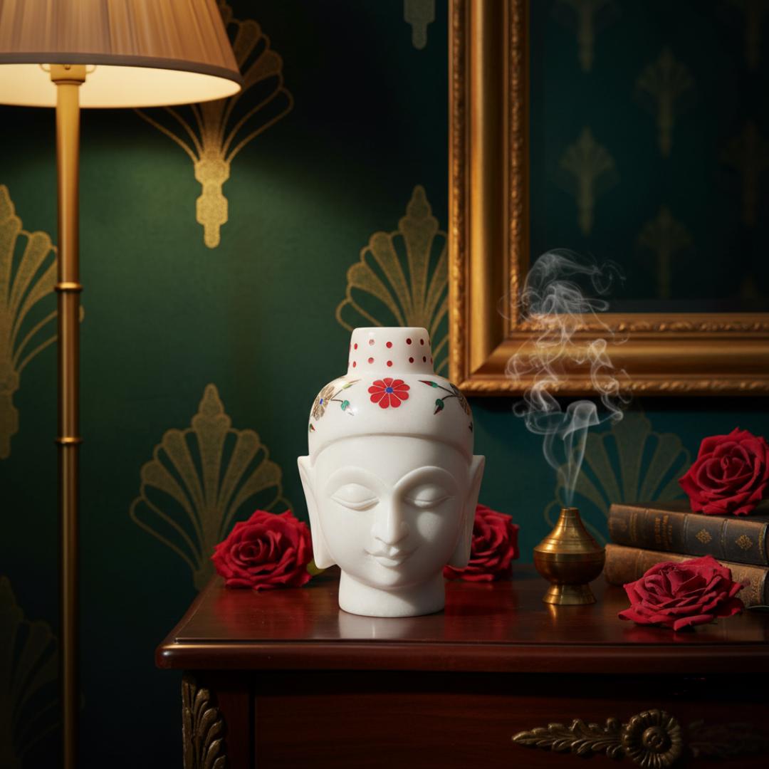 Add a touch of profound serenity and artistic elegance to your space with this Hand-Carved White Marble Buddha Head Sculpture, a captivating blend of spiritual essence and exquisite craftsmanship. Expertly sculpted from 100% natural white marble, this unique piece features a beautifully serene countenance adorned with intricate floral inlay work in vibrant red and subtle green—making it a true statement of peace for any home.