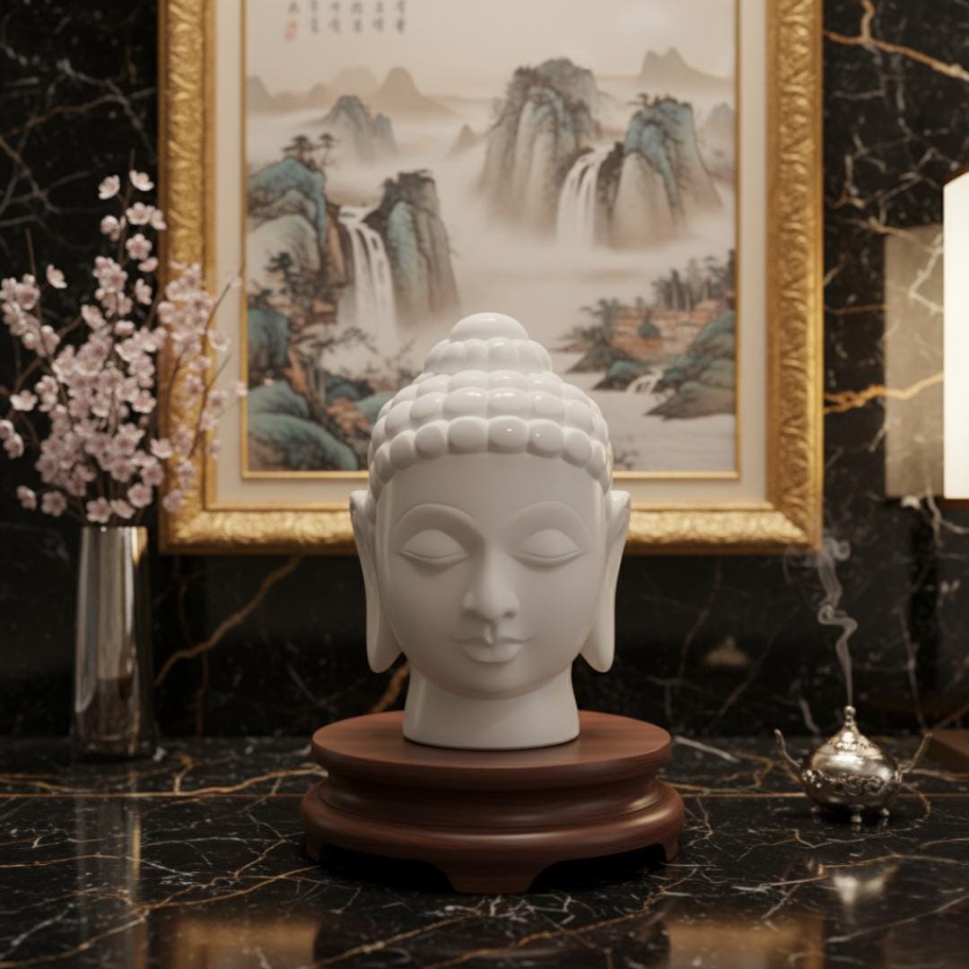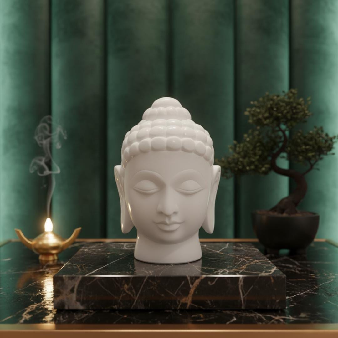 Bring an aura of peace and tranquility into your home with this exquisite Handcrafted White Marble Buddha Head Statue. Meticulously carved from 100% natural marble, this serene bust embodies timeless elegance and spiritual grace, making it a profound focal point for any interior. Each statue is a testament to the skill of artisans, who painstakingly sculpt the delicate features and traditional Usnisha (crown protuberance) with remarkable detail. The smooth, polished finish of the white marble catches the light beautifully, highlighting the meditative expression and creating a calming presence wherever it's placed. Ideal for enhancing a meditation space, adorning a console table, or adding a touch of sophisticated spiritual art to your living room, this Buddha head statue transcends mere decoration. It serves as a gentle reminder of inner peace and enlightenment, perfect for both contemporary and classic decor styles.
