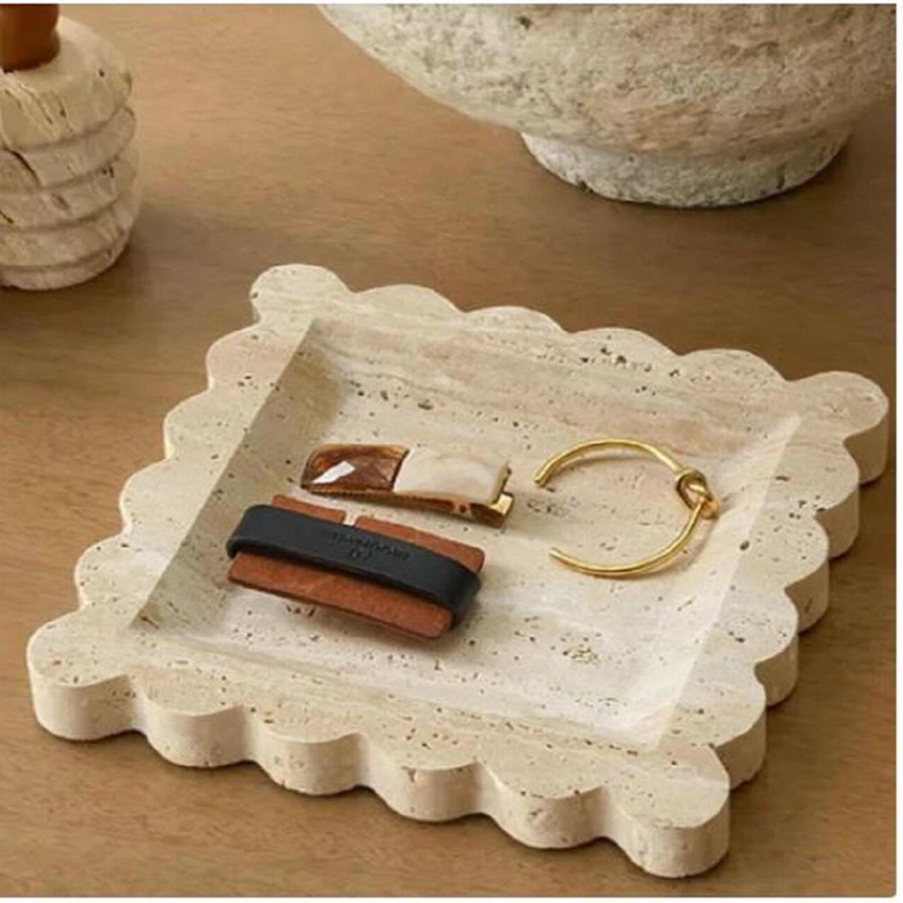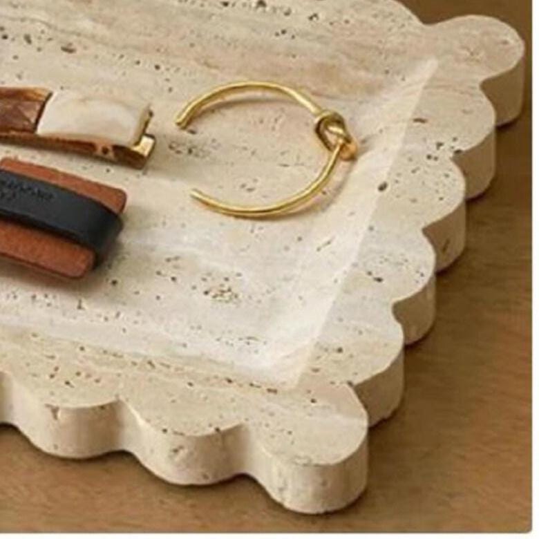 Add a touch of refined charm to your space with this beautifully sculpted scalloped tray, handcrafted from natural beige marble. Its soft wavy edges create a playful yet sophisticated silhouette, while the polished stone surface showcases delicate natural speckles unique to each piece. Perfect as a catchall for jewelry, keys, candles, or as a stylish accent on vanities, coffee tables, and entryways. Durable, timeless, and artfully designed — a modern décor essential made from genuine marble