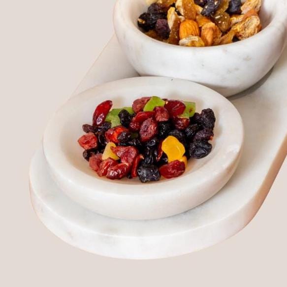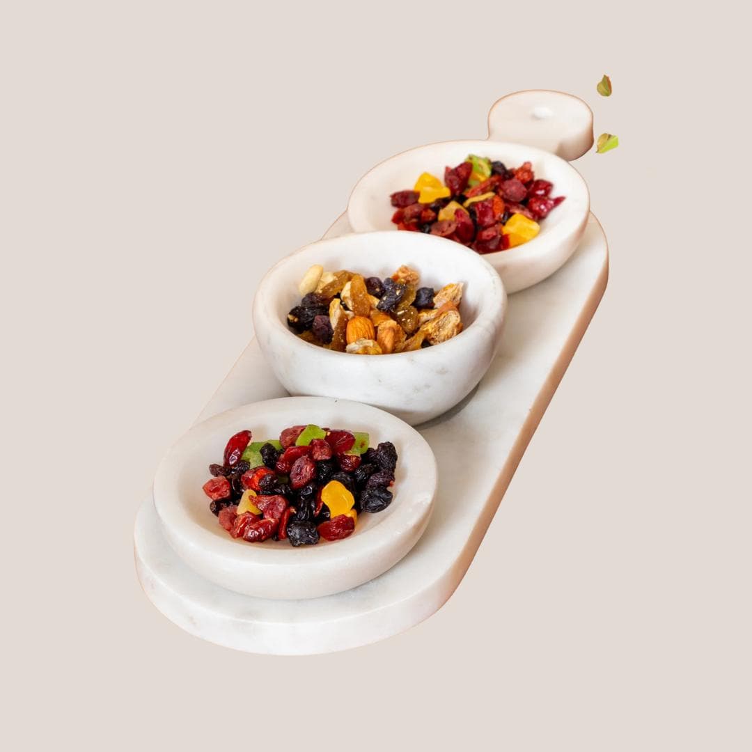 The sleek, elongated tray provides a sturdy base for the three perfectly sized bowls, ideal for serving dry fruits, nuts, dips, olives, or small candies. The natural veining of the marble ensures each set is utterly unique, adding an authentic touch of luxury to your table.