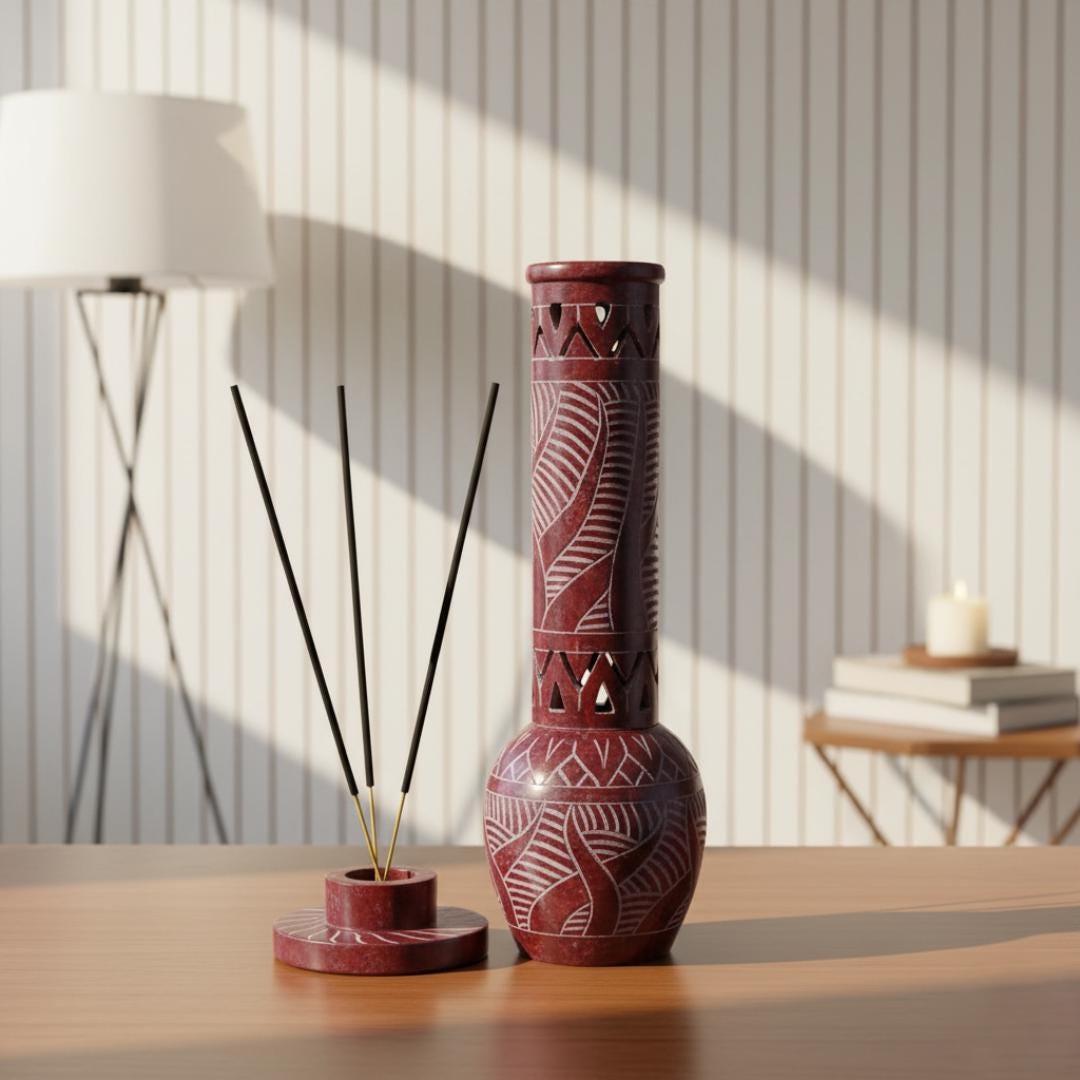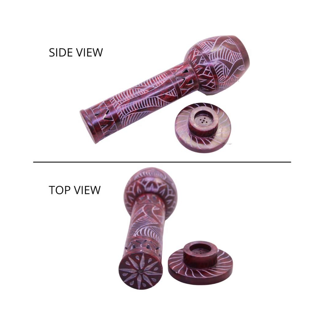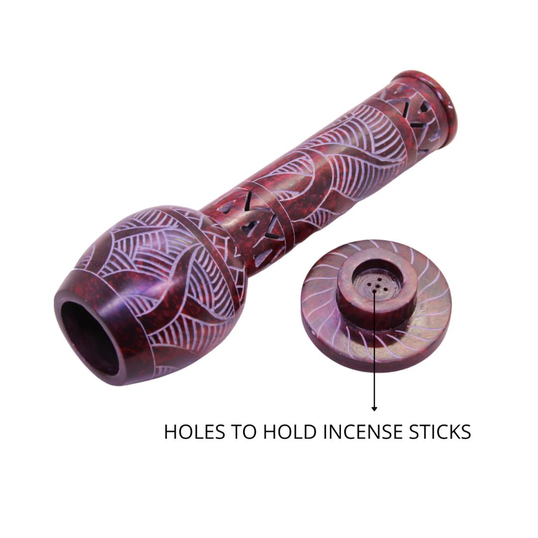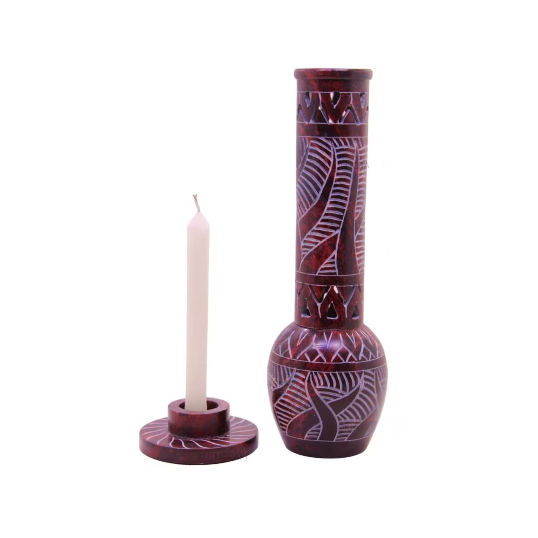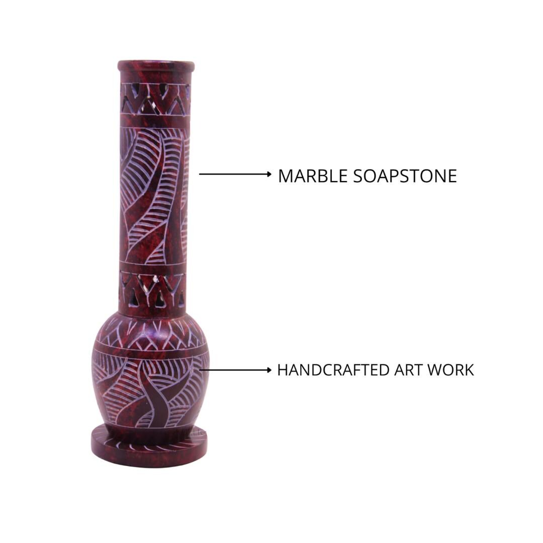 This incense stick and candle holder is handmade from soapstone. It has beautiful Jaali (openwork) designs, giving it a unique and elegant look.