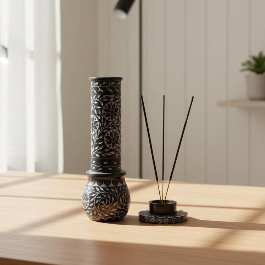 The top section is removable, and the base has a slot that holds the incense stick firmly. This design makes sure the ash falls neatly inside the holder without spilling outside.