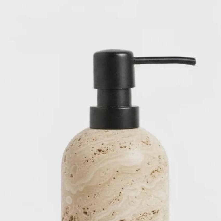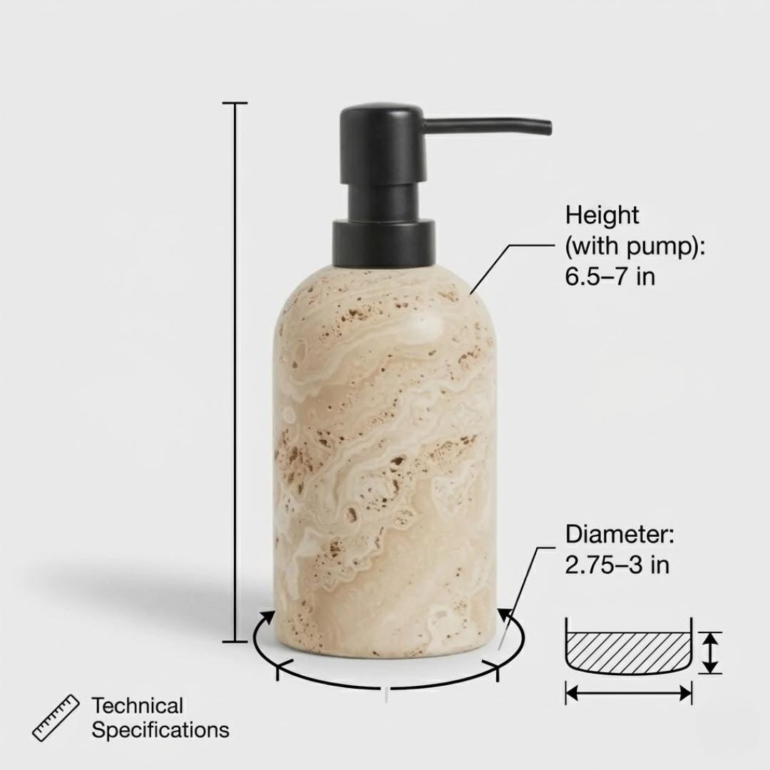 Highlights Ships from a small business in India Materials: Travertine Add a touch of natural elegance to your bathroom or kitchen with this Beige Travertine Soap Dispenser, beautifully crafted from real travertine stone. The warm beige tones and organic textures make each piece completely one-of-a-kind, showcasing the timeless beauty of natural stone.