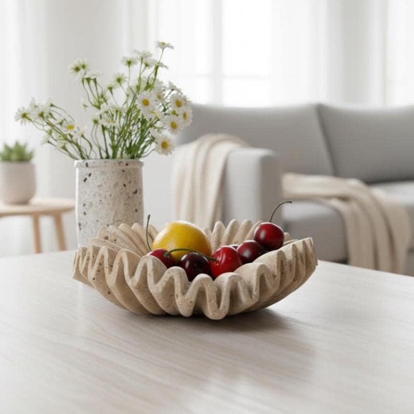 Bring an elegant touch of organic design into your home with this handcrafted ruffled traventine bowl. Made from natural speckled clay, each piece features beautifully wavy edges and soft folds that create a striking sculptural form. Its neutral tone complements any interior style—from modern minimalist to earthy boho.