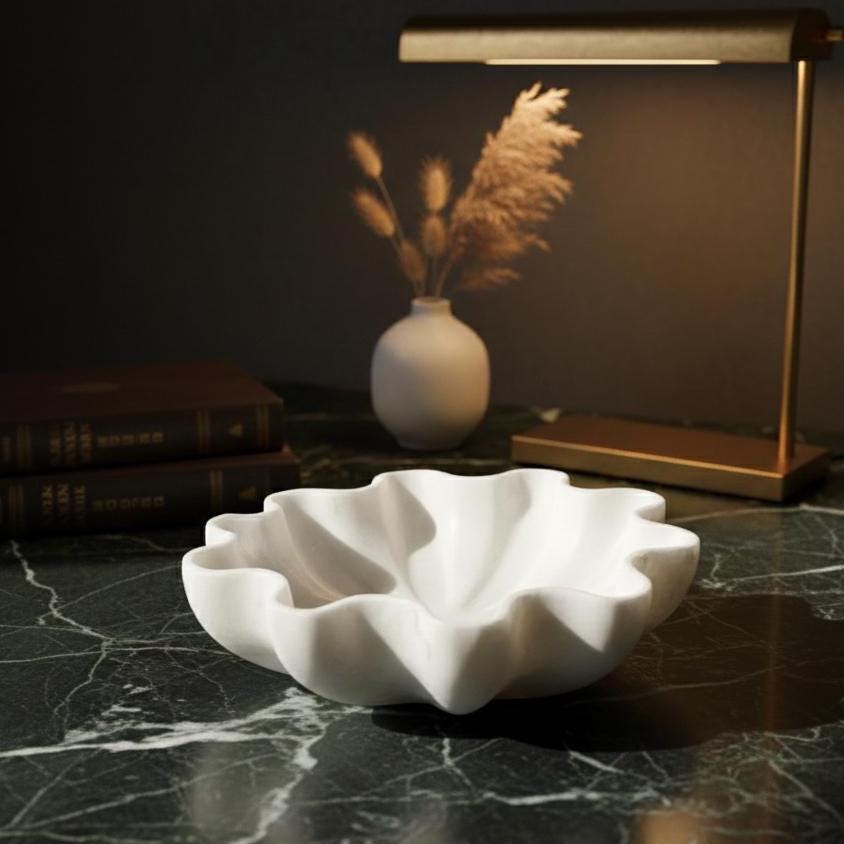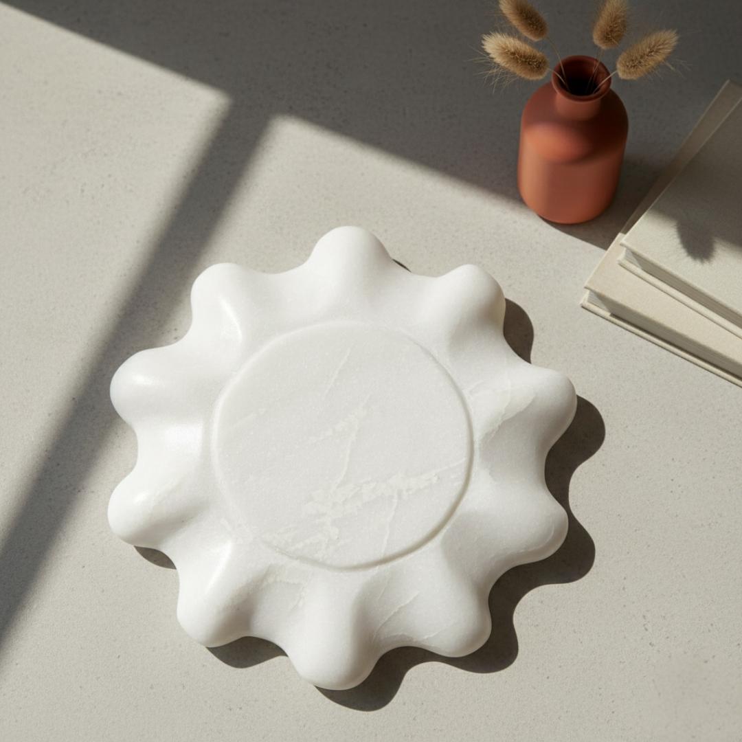 Handmade White Marble Ruffled & Wave Bowl – 12 Inch Diameter, 3 Inch Depth