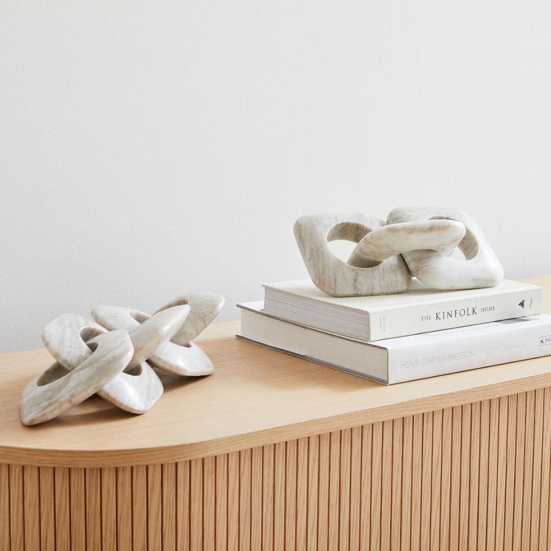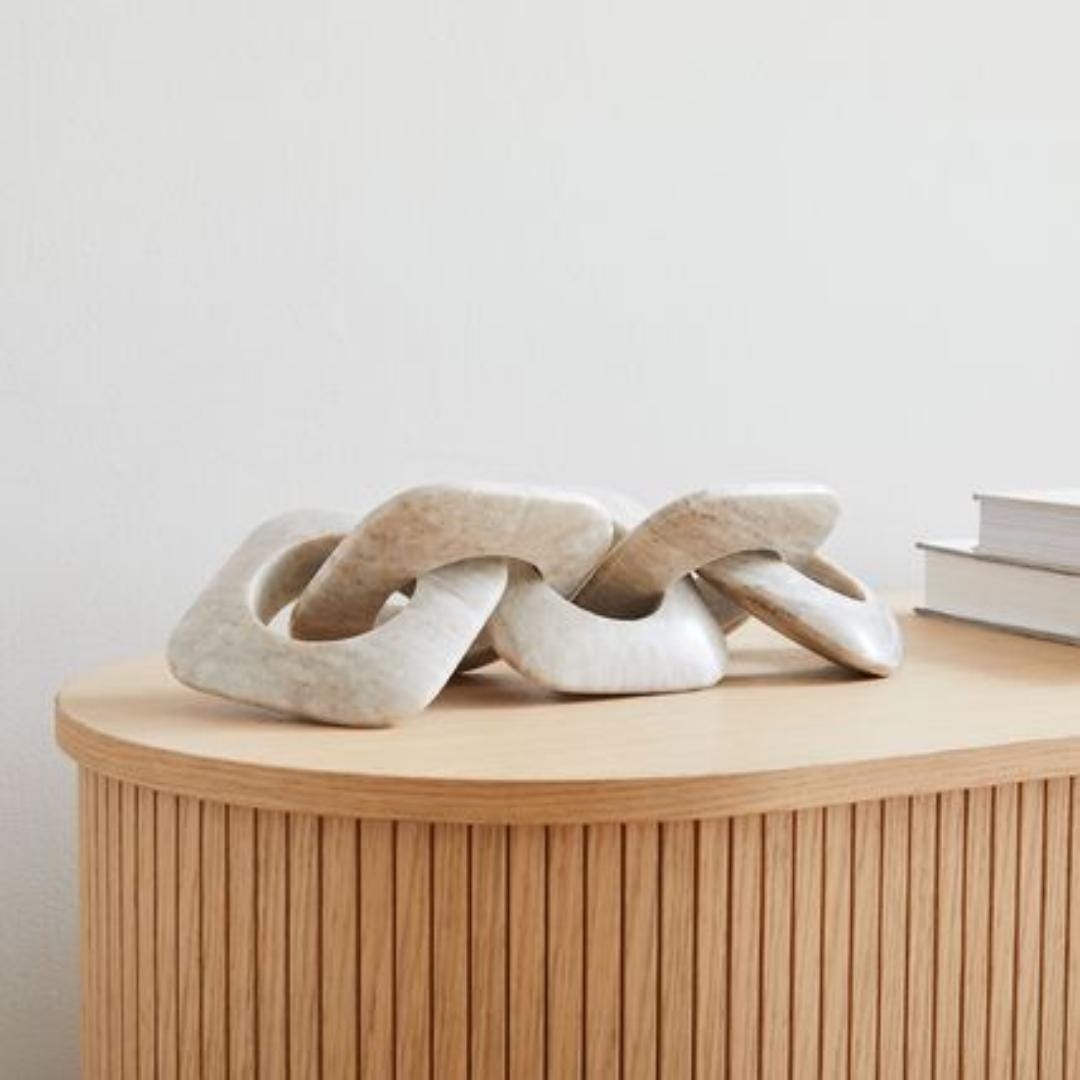 Crafted with a smooth, organic form and neutral stone tones, this marble chain link sculpture adds warmth, texture, and visual interest without overwhelming your space. Each oversized link features a hand-carved, natural stone appearance, making every piece truly unique.