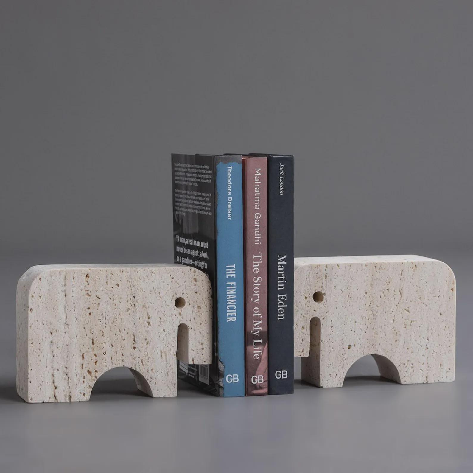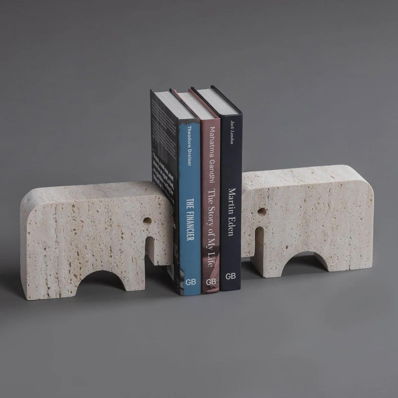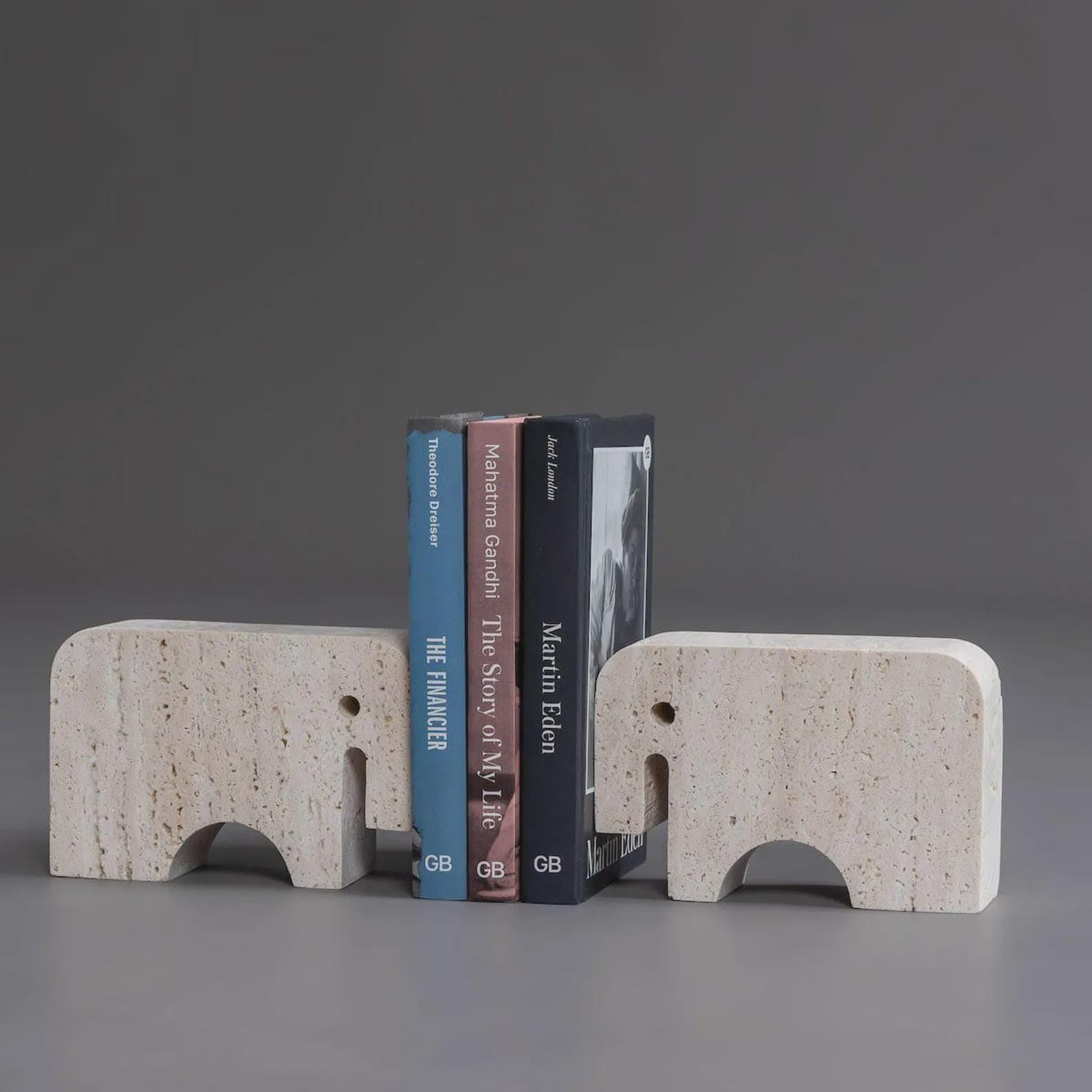 Elephant Stone Bookends – Handcrafted Travertine Animal Shelf Decor