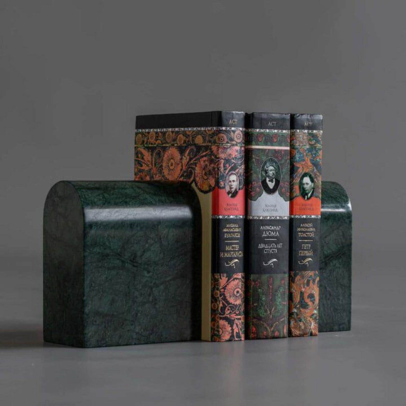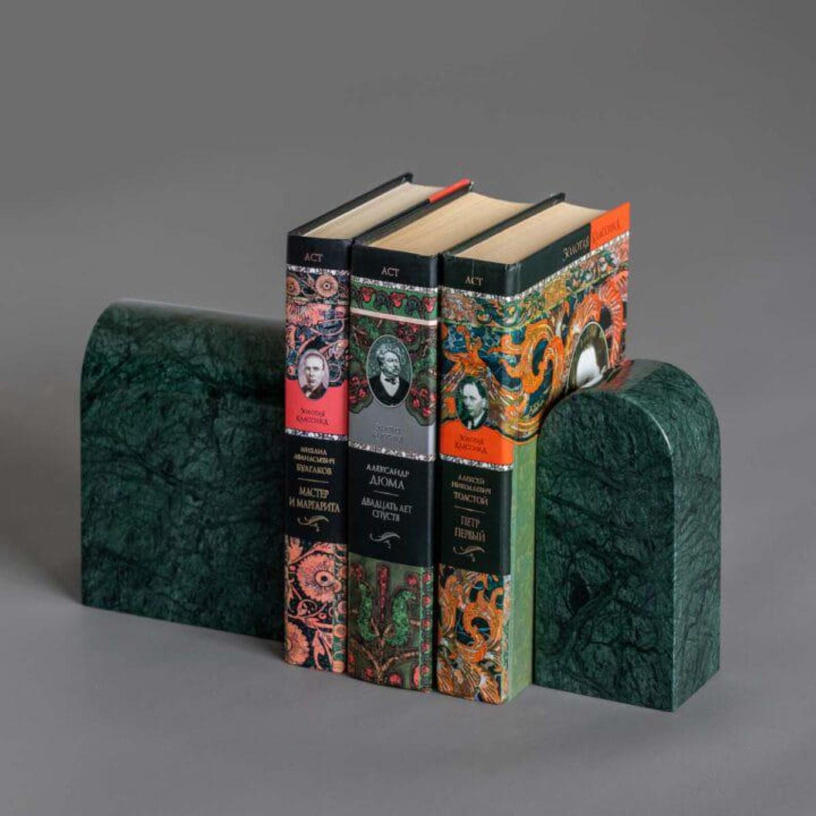 Bring timeless elegance and sculptural beauty to your bookshelves with this pair of green marble bookends, handcrafted from solid natural stone. Featuring rich deep-green tones, organic veining, and a smooth polished finish, these bookends are a sophisticated accent for modern and luxury interiors.