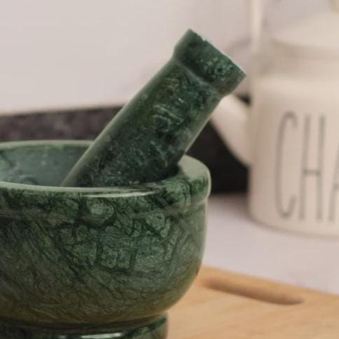 Elevate your kitchen with this handcrafted green marble mortar and pestle, a timeless tool designed for both function and style. Made from premium natural green marble, each set is unique, showcasing beautiful organic veining and a polished finish that enhances its luxurious, rustic appeal.