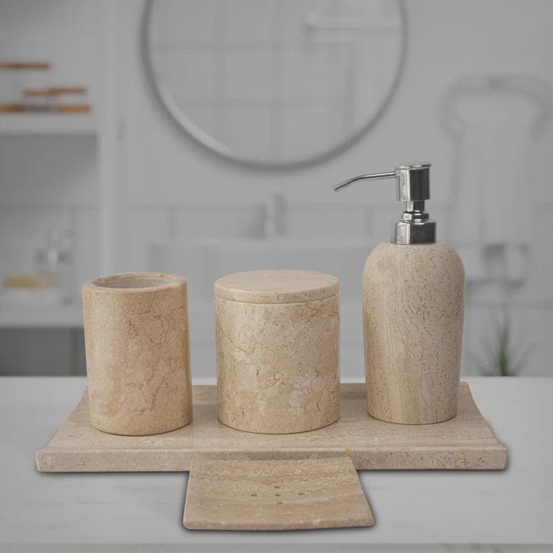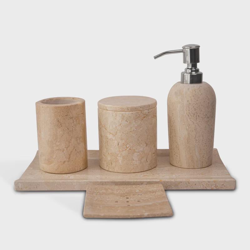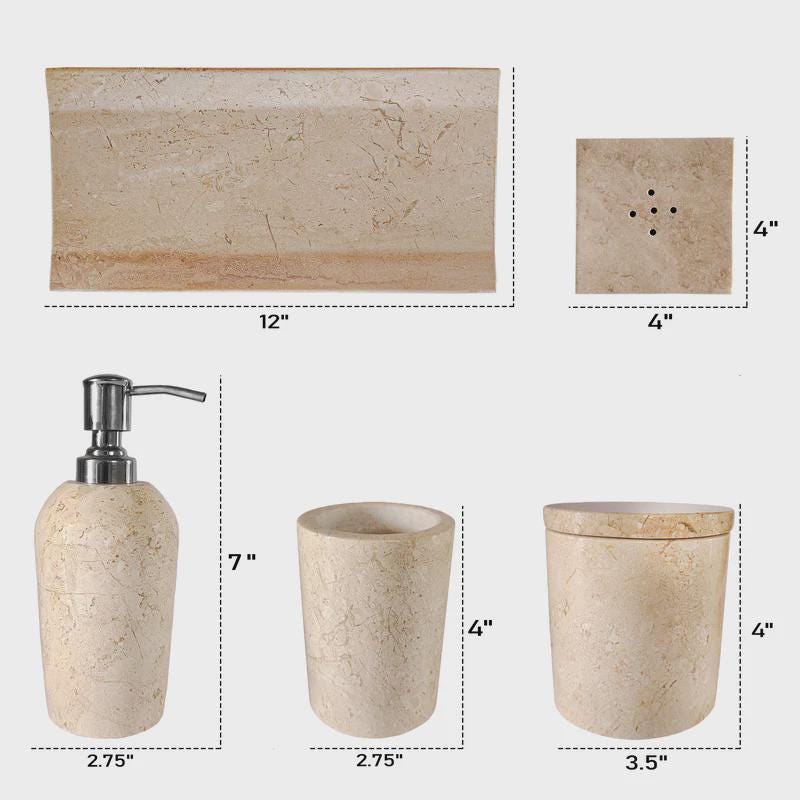 Each piece in this 5-item set is individually hand-carved and polished by skilled artisans, ensuring superior quality, durability, and a flawless finish that elevates any bathroom vanity.