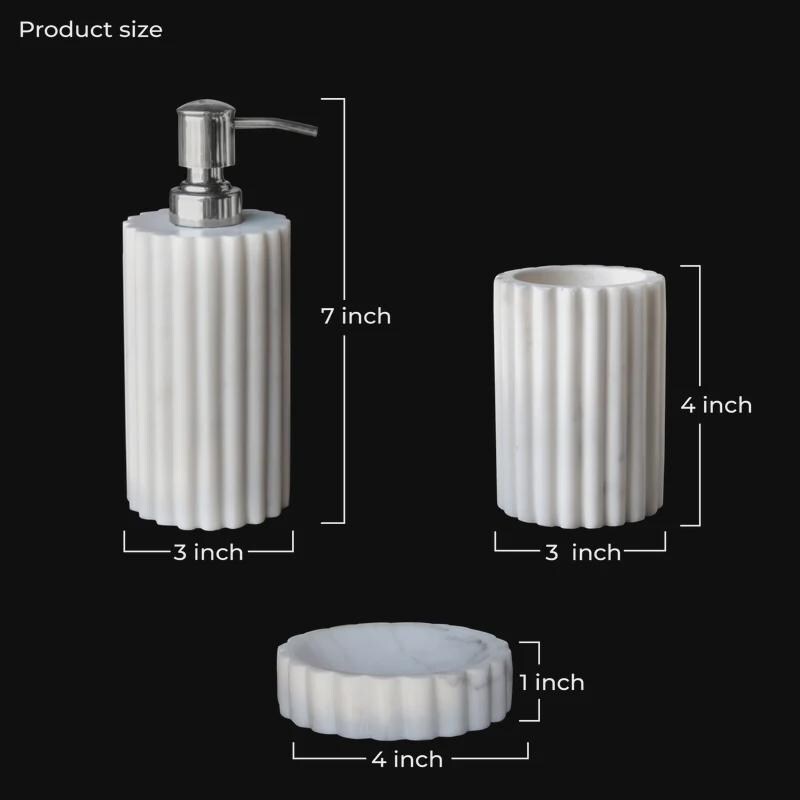 The soft white marble tones and sculptural fluted detailing create a calm, spa-style atmosphere while keeping your everyday essentials neatly organized. Perfect for modern, minimalist, and hotel-inspired interiors, this marble bathroom set blends timeless craftsmanship with contemporary design.