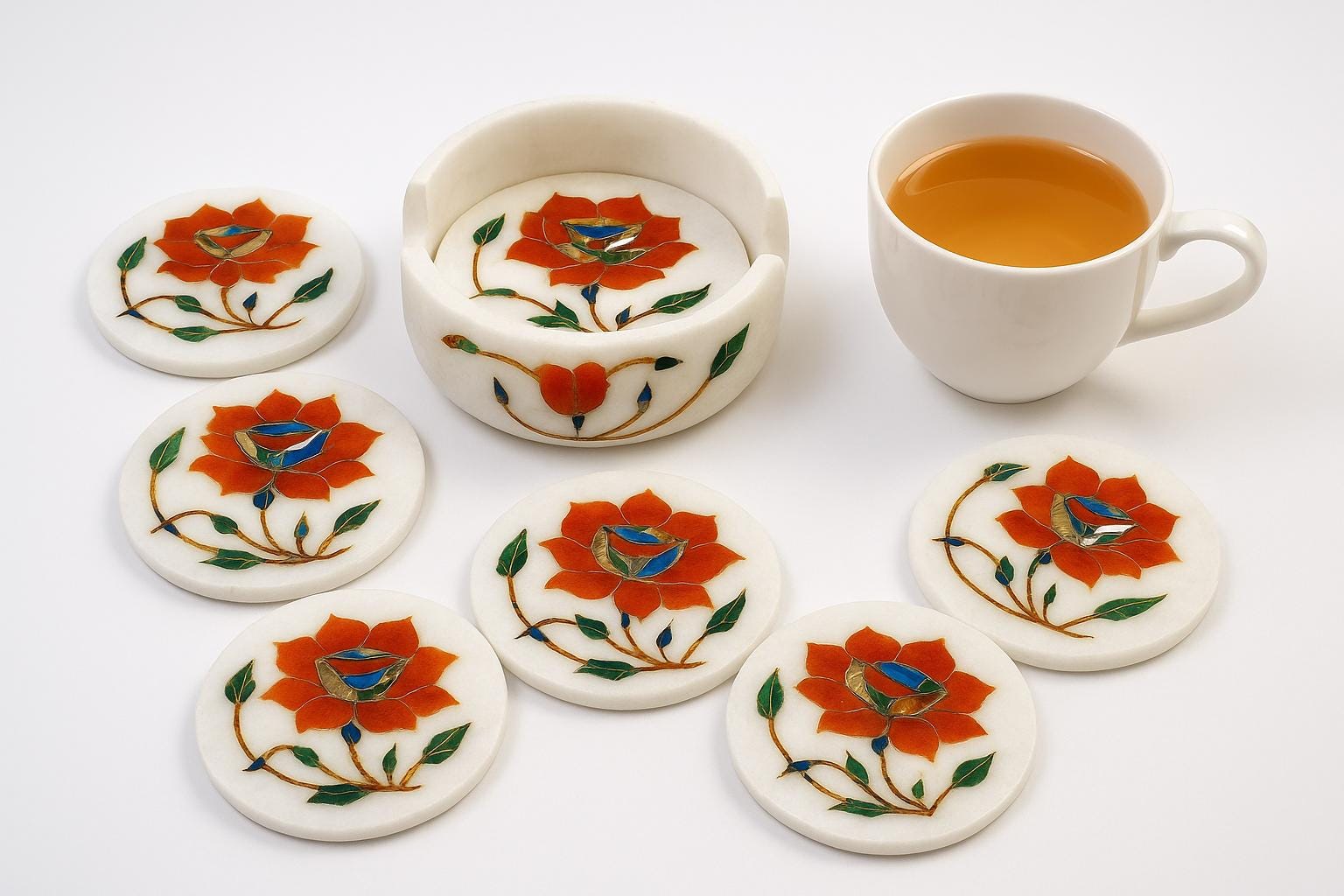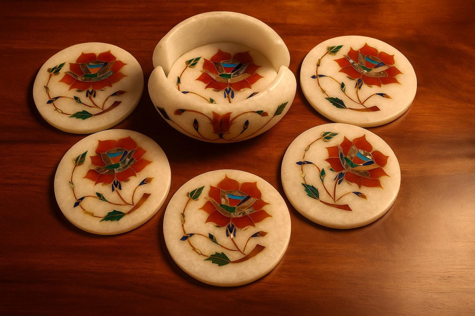 Handcrafted Marble & Semi-Precious Gemstone Inlay Coaster Set with Holder – Floral Design