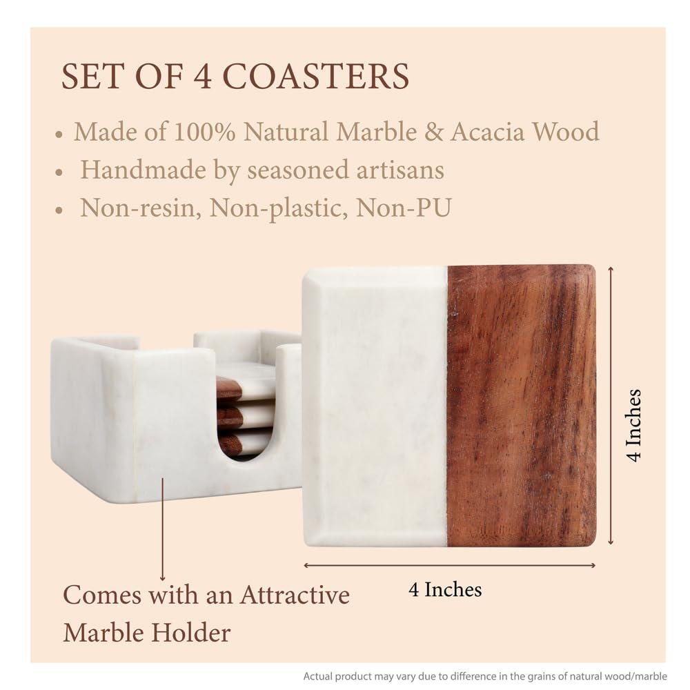 ✨ Key Features • Set of 4 marble coasters — perfect for drinks, mugs, glasses, and more • Acacia wood holder keeps coasters organized and stylish • Natural white marble with unique veining — each piece is one-of-a-kind • Non-skid pads protect surfaces and prevent slipping • Durable and easy to clean — simply wipe with a damp cloth