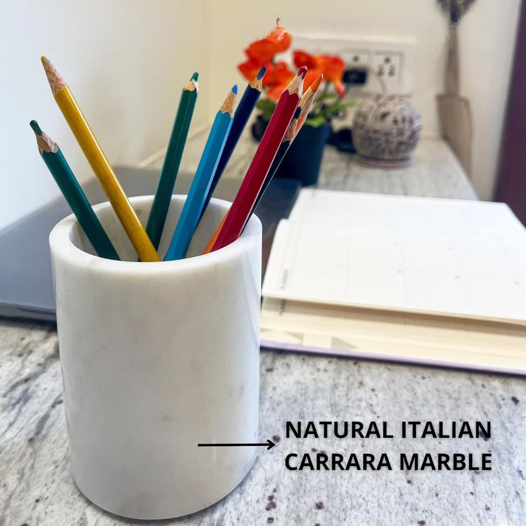 Elevate your workspace with this premium Natural Marble Pencil Holder — a handcrafted desk organizer made from genuine Italian Carrara marble. Each piece features unique natural veining and a polished finish that enhances any desk, vanity, or countertop. Designed to be both functional and decorative, this marble pen stand securely holds pencils, pens, markers, brushes, and more, keeping your essentials neatly organized and easily accessible.