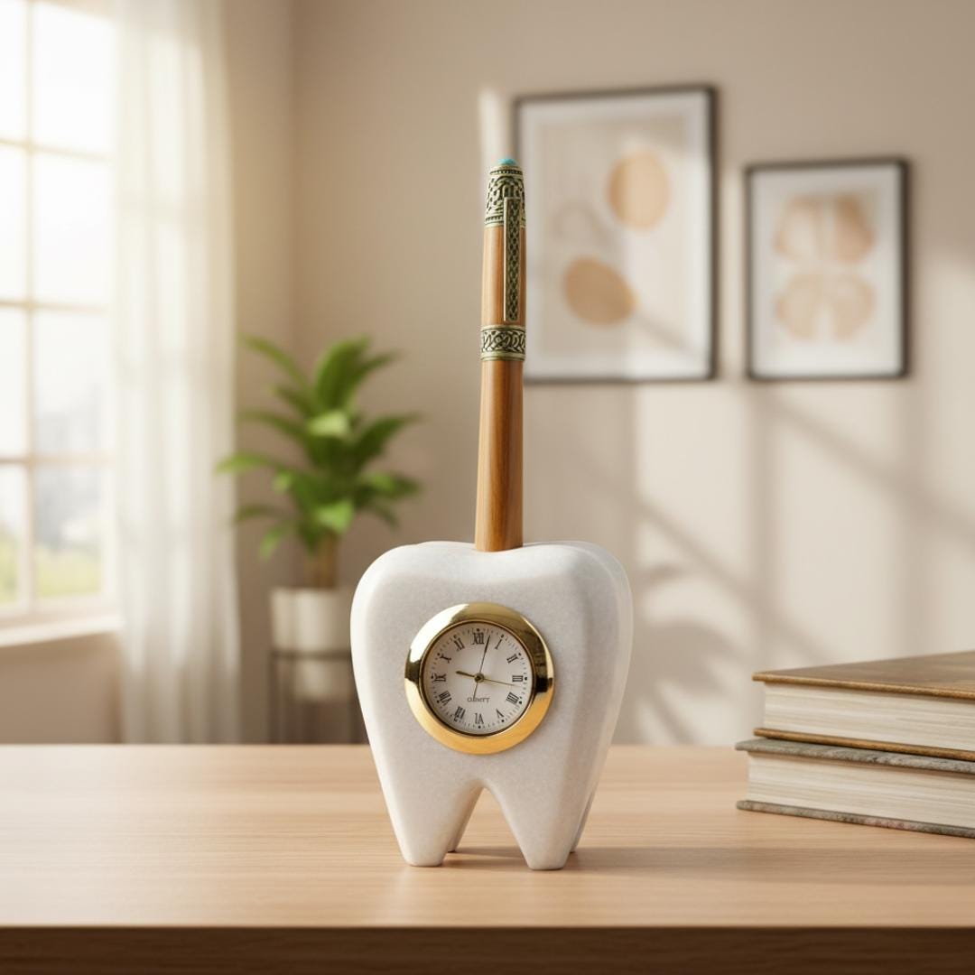 Introduce a timeless keepsake that celebrates dental professionals — a Tooth Shaped Marble Desk Clock & Pen Stand crafted from classic Makrana marble. This distinctive piece combines function and flair, serving as a clock, paperweight, and pen holder — perfect for dentist offices, clinics, desks, or home workspaces.