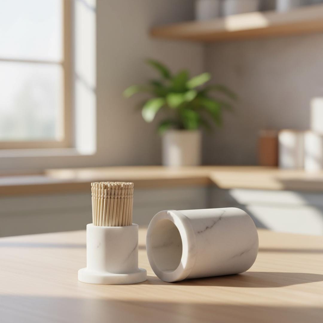 🌟 Key Features • Premium Marble Construction: Crafted from real natural stone for durability and timeless beauty. • Hygienic Storage: The lid protects toothpicks from dust and keeps them clean for guests and family use. • Versatile Use: Perfect for toothpicks, cocktail sticks, appetizer picks, and more — ideal for everyday dining, parties, weddings, or restaurant services. • Elegant Decor Piece: Smooth polished marble finish adds sophistication to any countertop or tabletop. • Perfect Gift: A unique and thoughtful housewarming, bridal shower, or kitchen accessory gift.