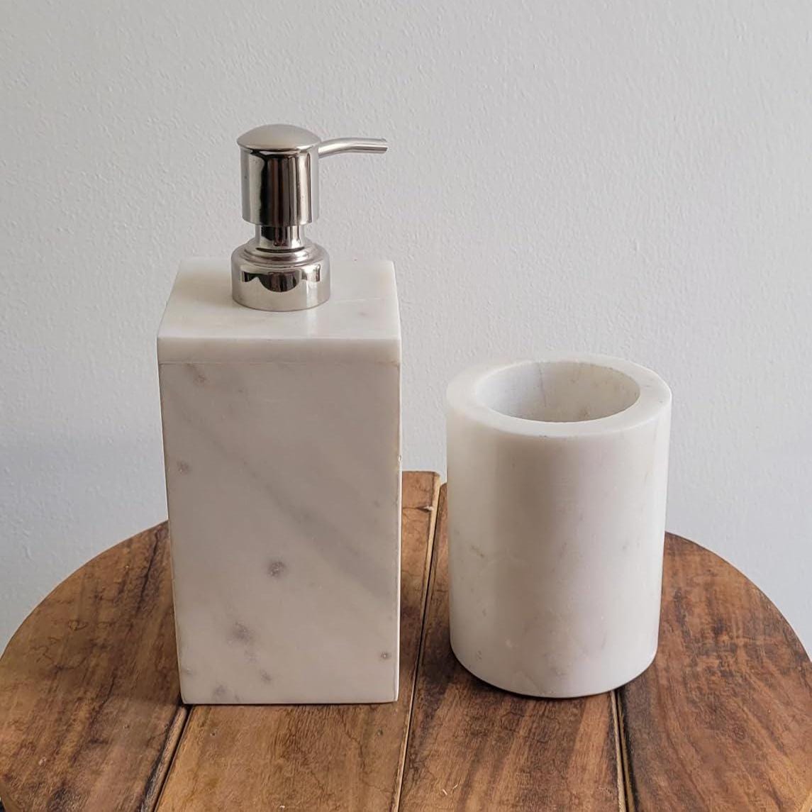 Elevate your bathroom décor with this Handmade Marble Bathroom Set, a premium 4-piece vanity accessory collection designed to bring style, organization, and functionality to any countertop. Crafted with care, this set includes a soap dispenser, toothbrush holder, tumbler, and soap dish, offering a complete solution for keeping daily essentials neatly arranged and beautifully styled.