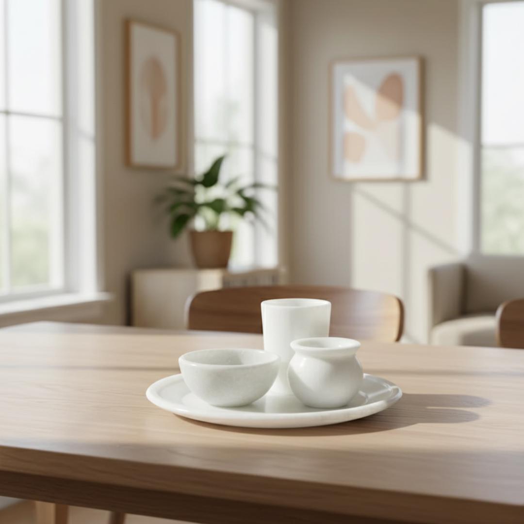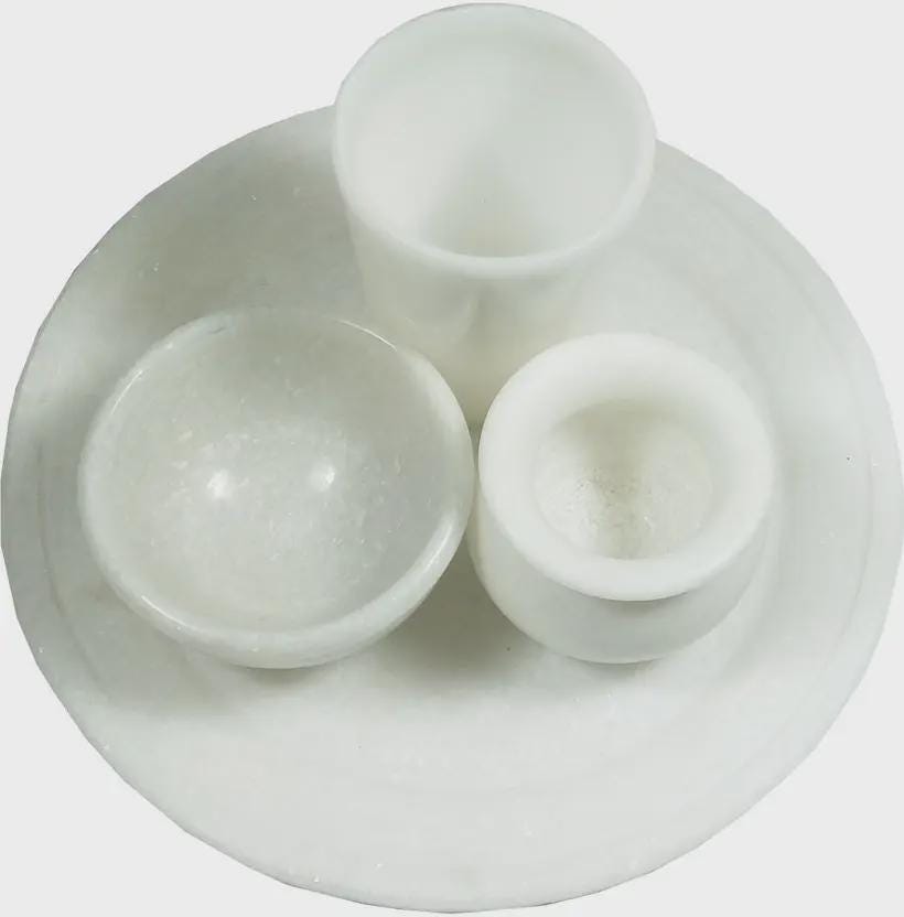 Size: 15 cm x 15 cm x 1 cm Included: 1 Plate, 1 Glass, 1 Bowl, 1 Lota