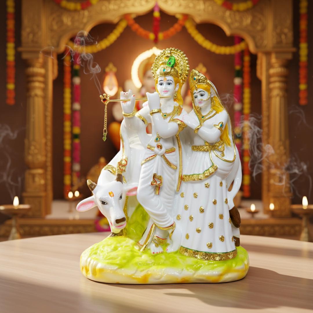 Invite devotion, love, and serenity into your home with this handcrafted marble dust Radha Krishna idol — a beautiful representation of the divine couple that symbolizes eternal love, harmony, and spiritual connection. Made with premium marble dust and showcased with refined detailing and elegant golden accents, this 23 cm (≈9 inch) statue is perfect for homes, pooja rooms, offices, or sacred décor spaces.