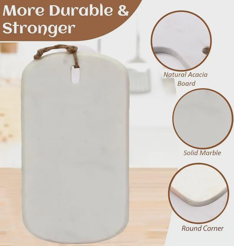 ✨ Why You’ll Love It • Durable Natural Marble: Solid and sturdy stone that resists scratches and warping, designed to last for years. • Non-Porous & Easy to Clean: Smooth surface won’t absorb liquids or odors — just wipe clean after use. • Cool Surface: Naturally cool marble is perfect for rolling dough, pastry prep, or keeping soft foods like cheese at their best. • Elegant Design: Unique natural veining in marble makes every board one-of-a-kind, adding a sophisticated touch to any kitchen or dining space. • Versatile & Stylish: Use it as a chopping board, serving platter, or kitchen décor accent — ideal for everyday meals and special occasions.