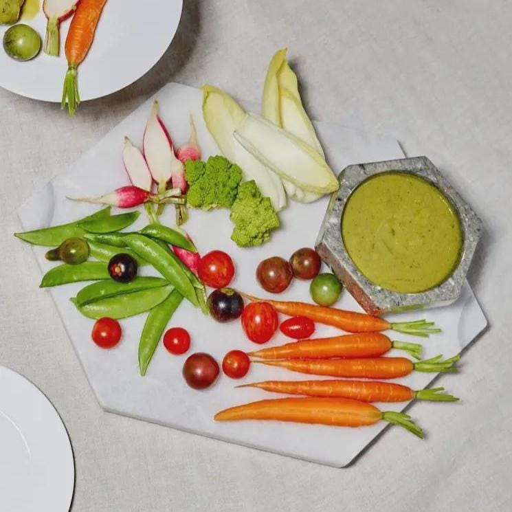 Crafted from quality marble/stone, this hexagon cutting board stands out with its unique shape and chic minimalist aesthetic. The polished surface is naturally smooth and durable, ideal for slicing vegetables, fruits, herbs, cheese, and more. Because it’s made from natural stone, every board has distinctive veining and color variation, making each piece a unique artisan accent for your home.