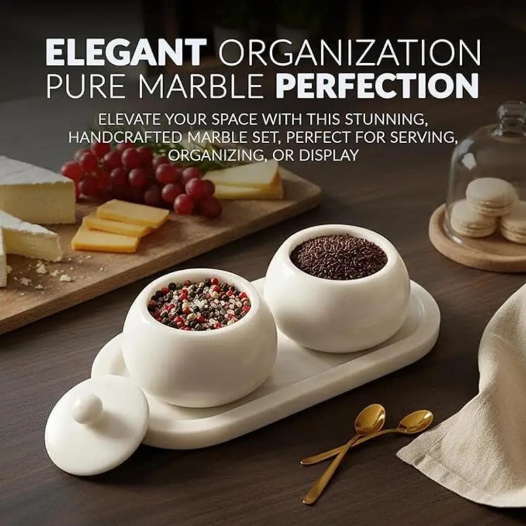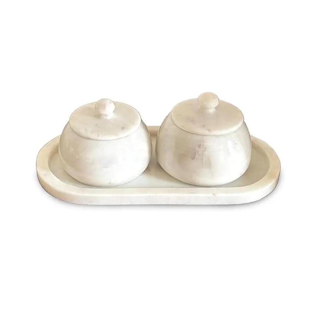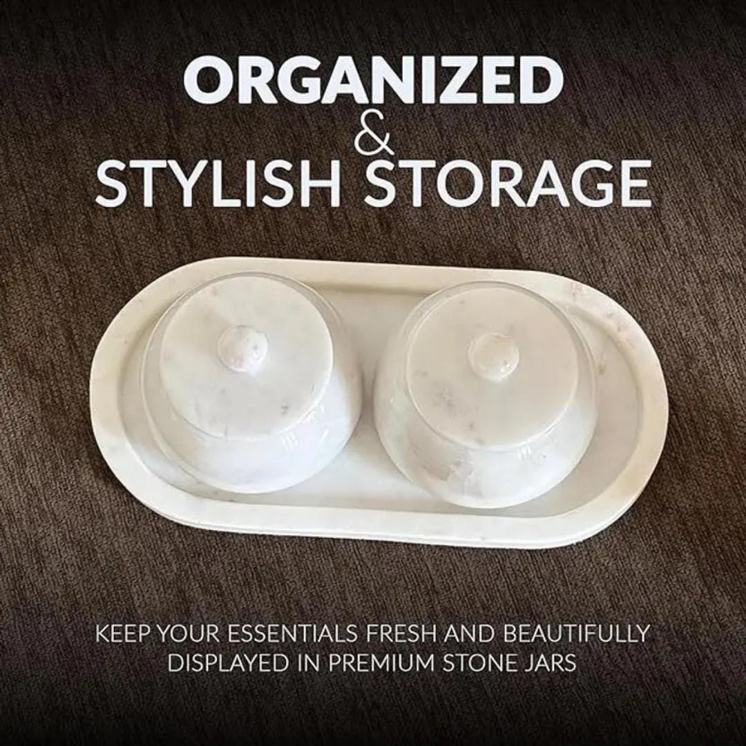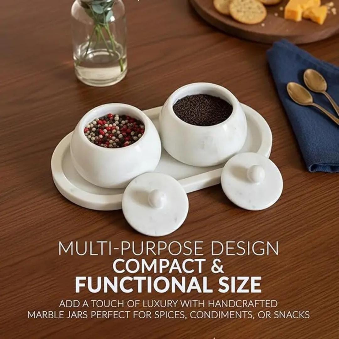 Elevate your serving experience with this beautifully crafted Handmade White Marble Serving Tray Set — a perfect blend of functionality and artistic elegance. This thoughtfully designed set includes a rectangular premium white marble tray with two matching marble bowls with lids — ideal for serving snacks, condiments, dry fruits, spices, or decorative accents.