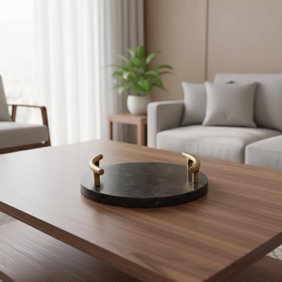 Handmade Green Marble Serving Tray with Gold Handles – Elegant Round Stone Platter for Serving & Home Décor