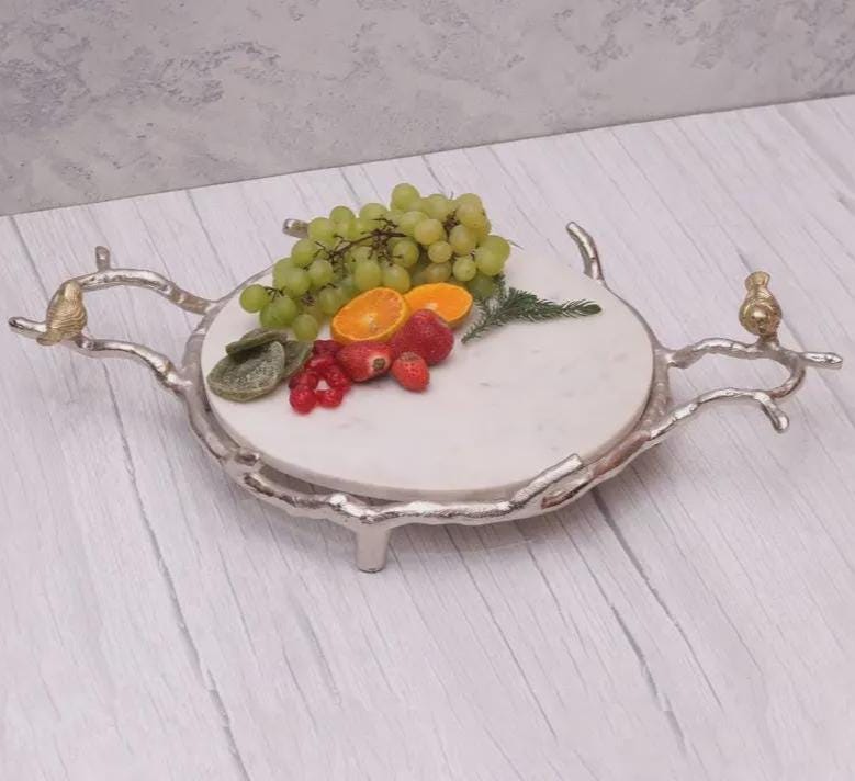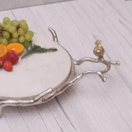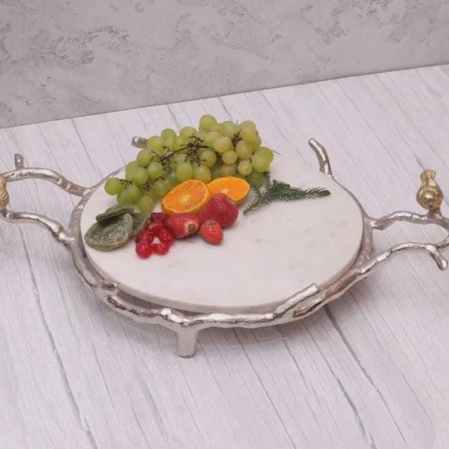 Large Round White Marble Serving Tray with Silver Bird Handles | Handmade Fruit Platter for Entertaining