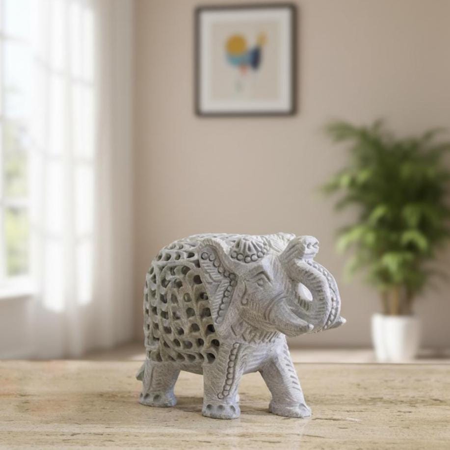 Add timeless charm, cultural beauty, and positive energy to your home with this Hand Carved Soapstone Elephant Statue. Expertly crafted by skilled Indian artisans, this antique-style elephant figurine is carved from natural soapstone, showcasing intricate detailing and traditional craftsmanship.