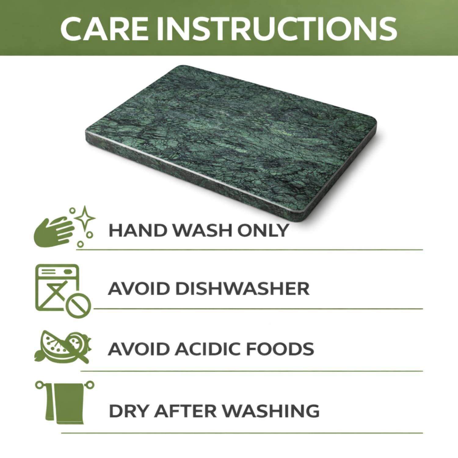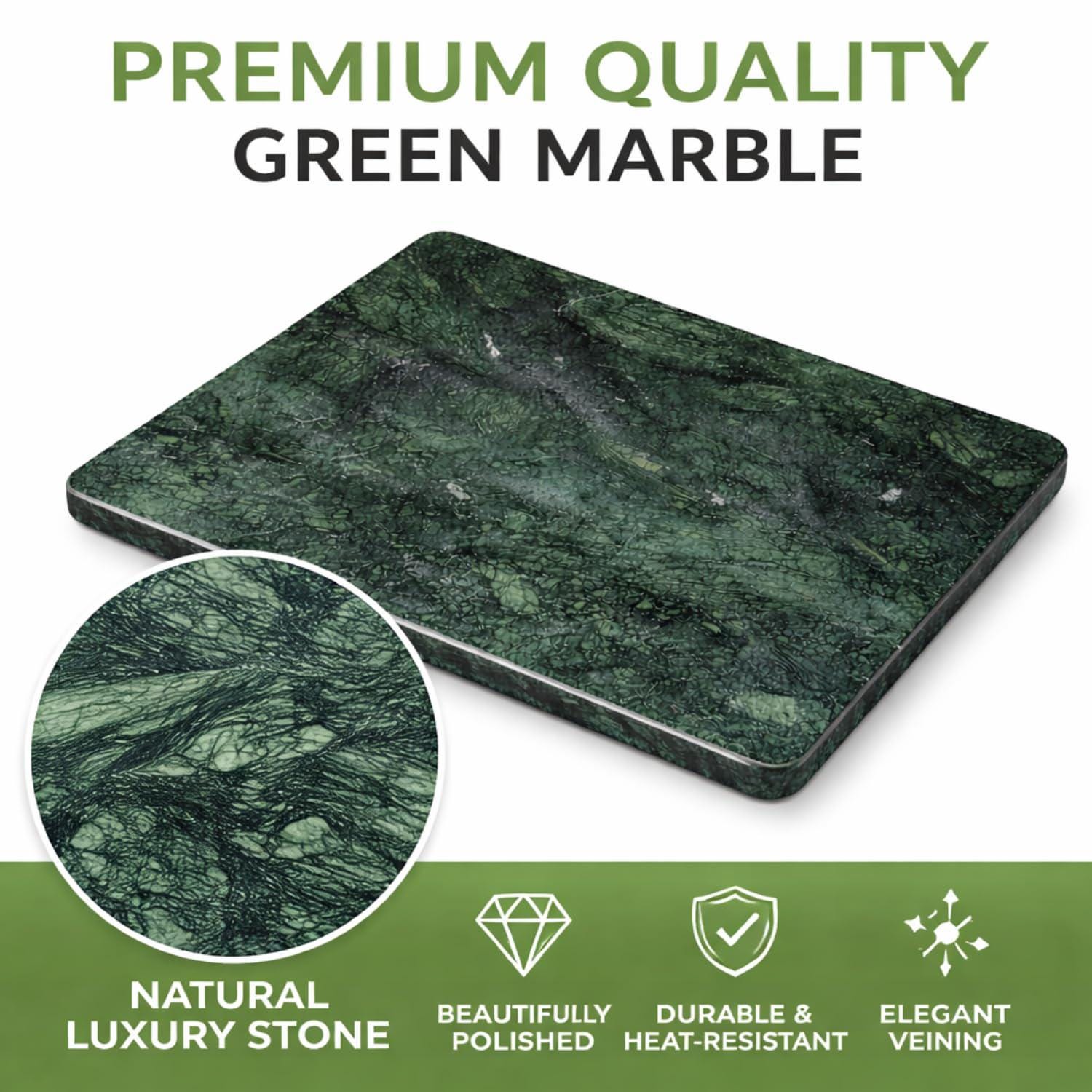 Each piece is made from 100% natural green marble, showcasing rich tones, unique veining, and natural color variations that make every board truly one-of-a-kind. The sturdy construction and smooth polished finish ensure long-lasting durability and timeless style.