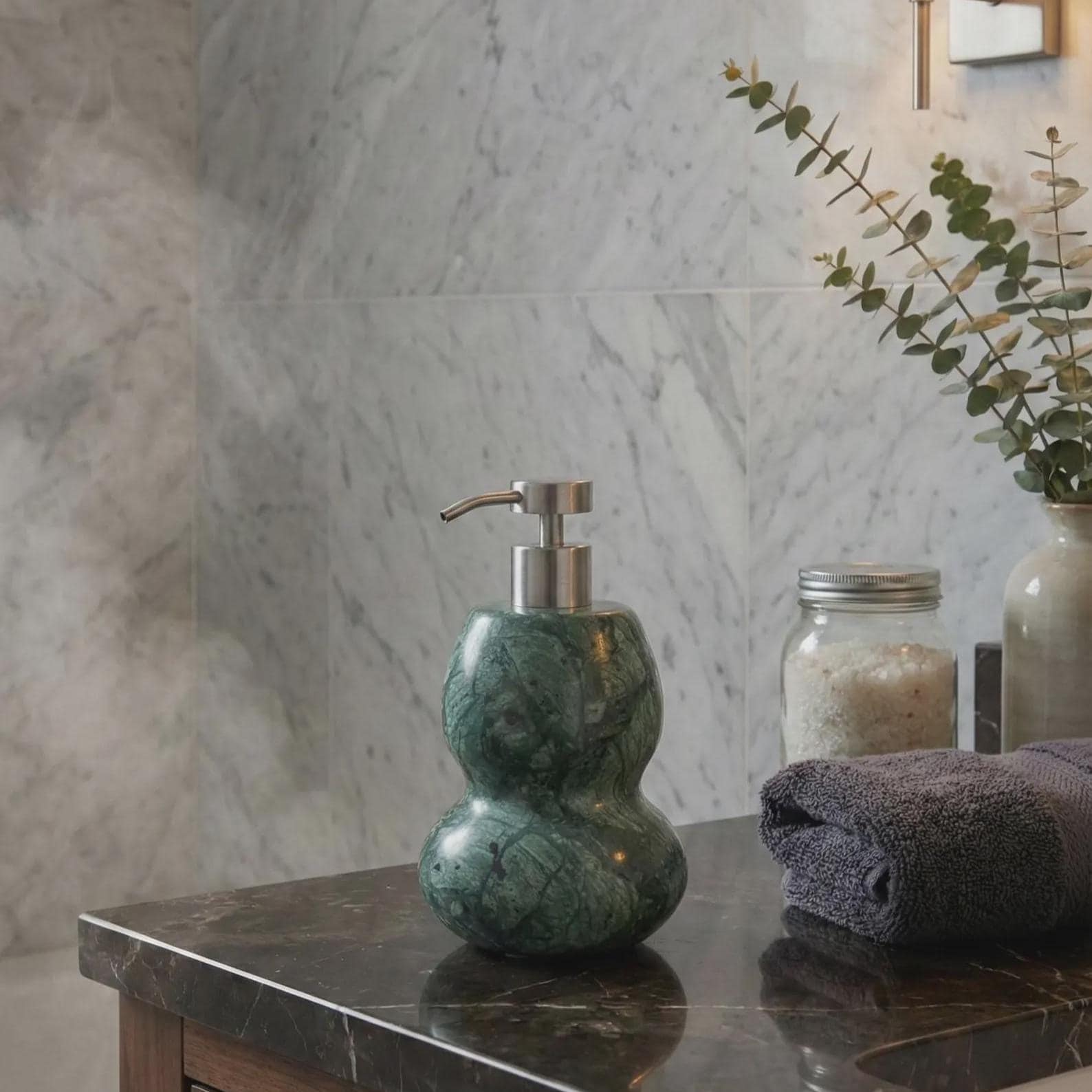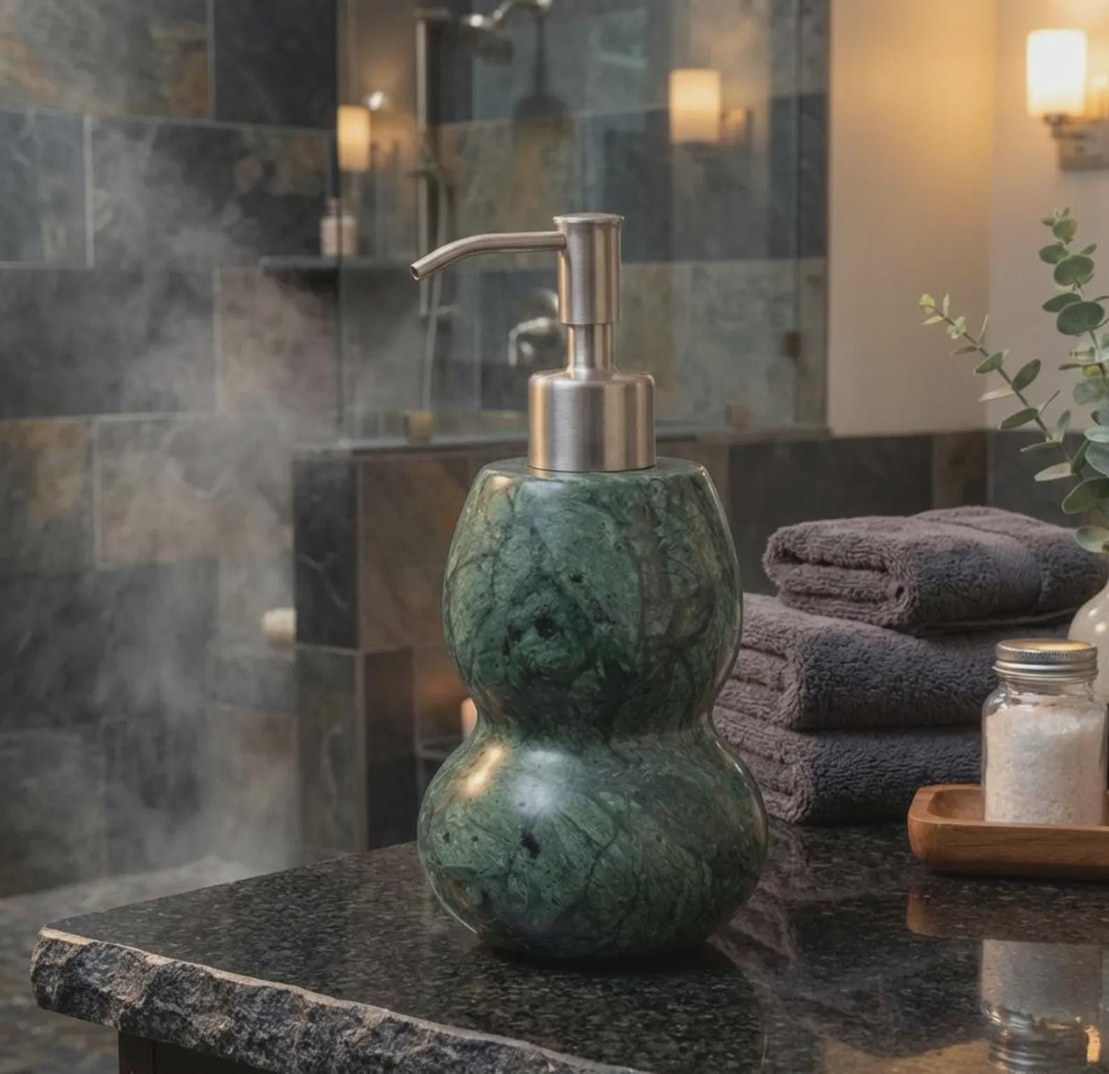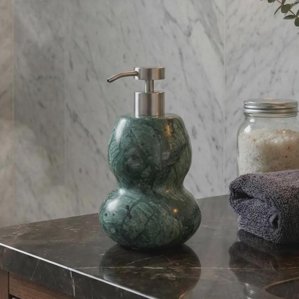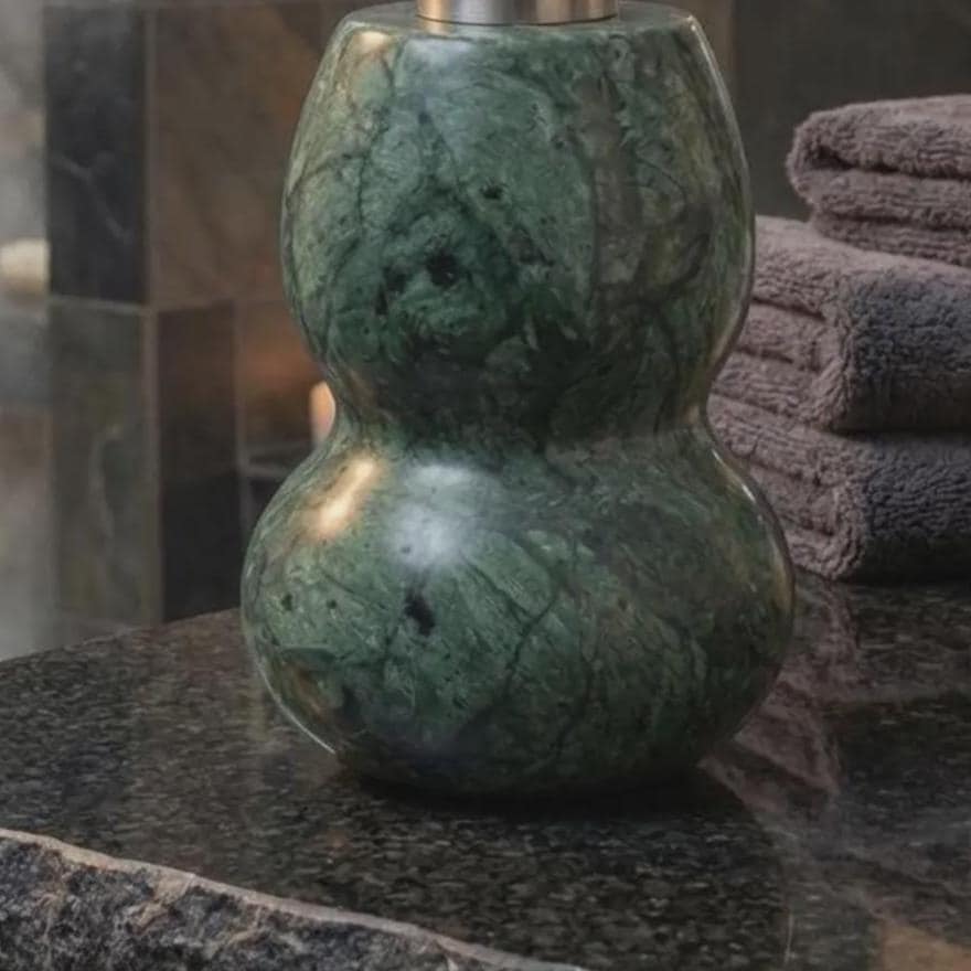 ✔ Made from solid natural green marble ✔ Elegant pear / curvy sculptural design ✔ Heavy & stable – won’t tip easily ✔ Premium metal pump for smooth dispensing ✔ Each piece has unique marble veining ✔ Eco-friendly alternative to plastic bottles
