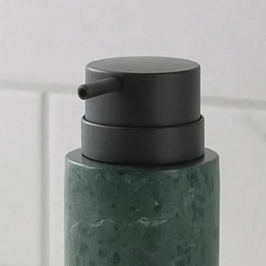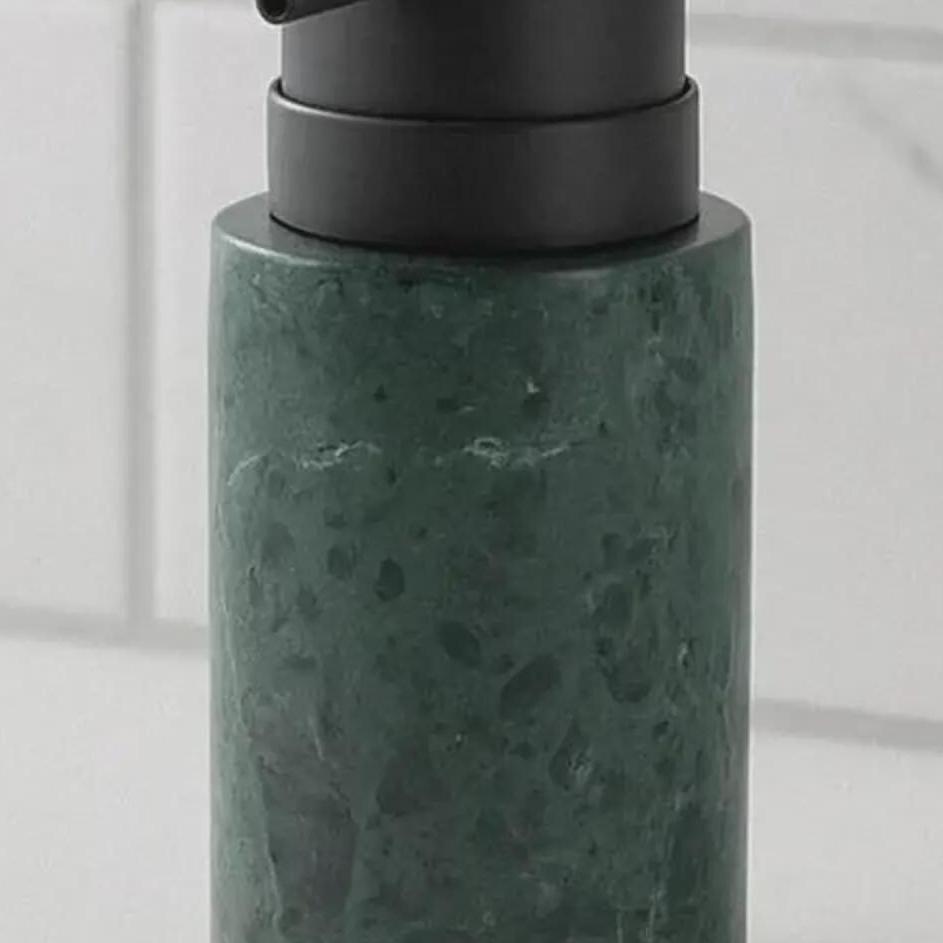 Material: Natural Green Marble Pump: Metal pump top Finish: Smooth polished stone Style: Modern, spa, luxury decor Use: Soap, lotion, sanitizer dispenser (Natural marble will vary in color, veining & pattern — this is the beauty of real stone.)