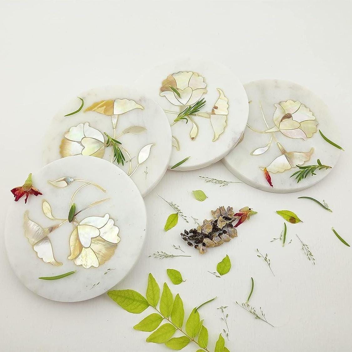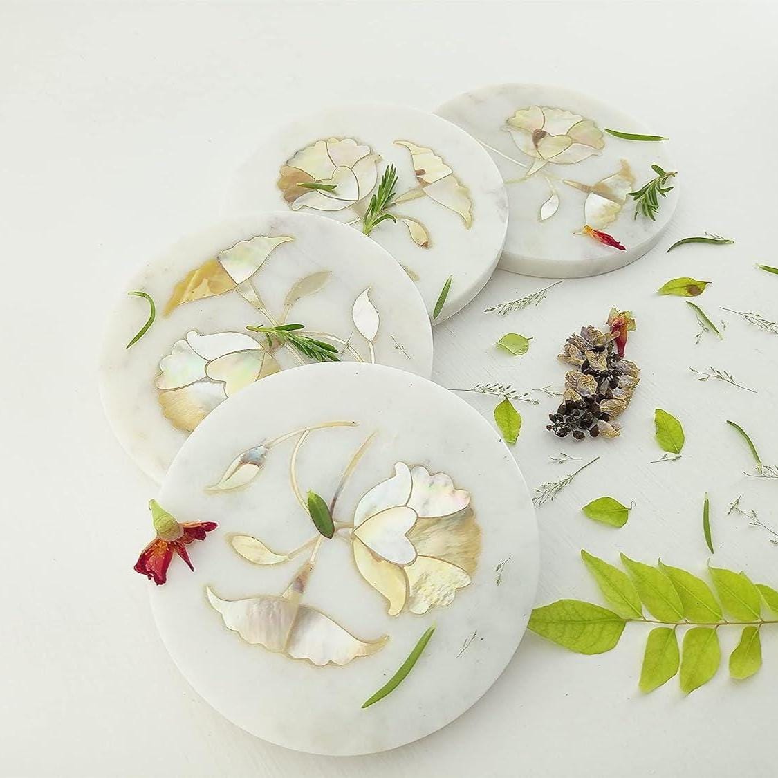 ✔ Set of 4 Handmade Marble Coasters ✔ Natural White Marble Stone ✔ Floral Semi-Precious Stone Inlay ✔ Smooth Polished Surface ✔ Heat & Moisture Resistant ✔ Protects Tables & Countertops ✔ Elegant & Durable Design ✔ Each Piece is Unique