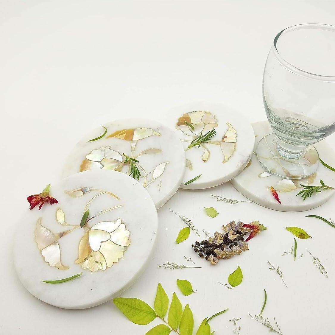Protect your furniture in timeless style with this handcrafted white marble inlay coaster set. Each coaster is made from 100% natural white marble and beautifully decorated with traditional hand-set floral stone inlay work, inspired by classic Indian Pietra Dura craftsmanship.
