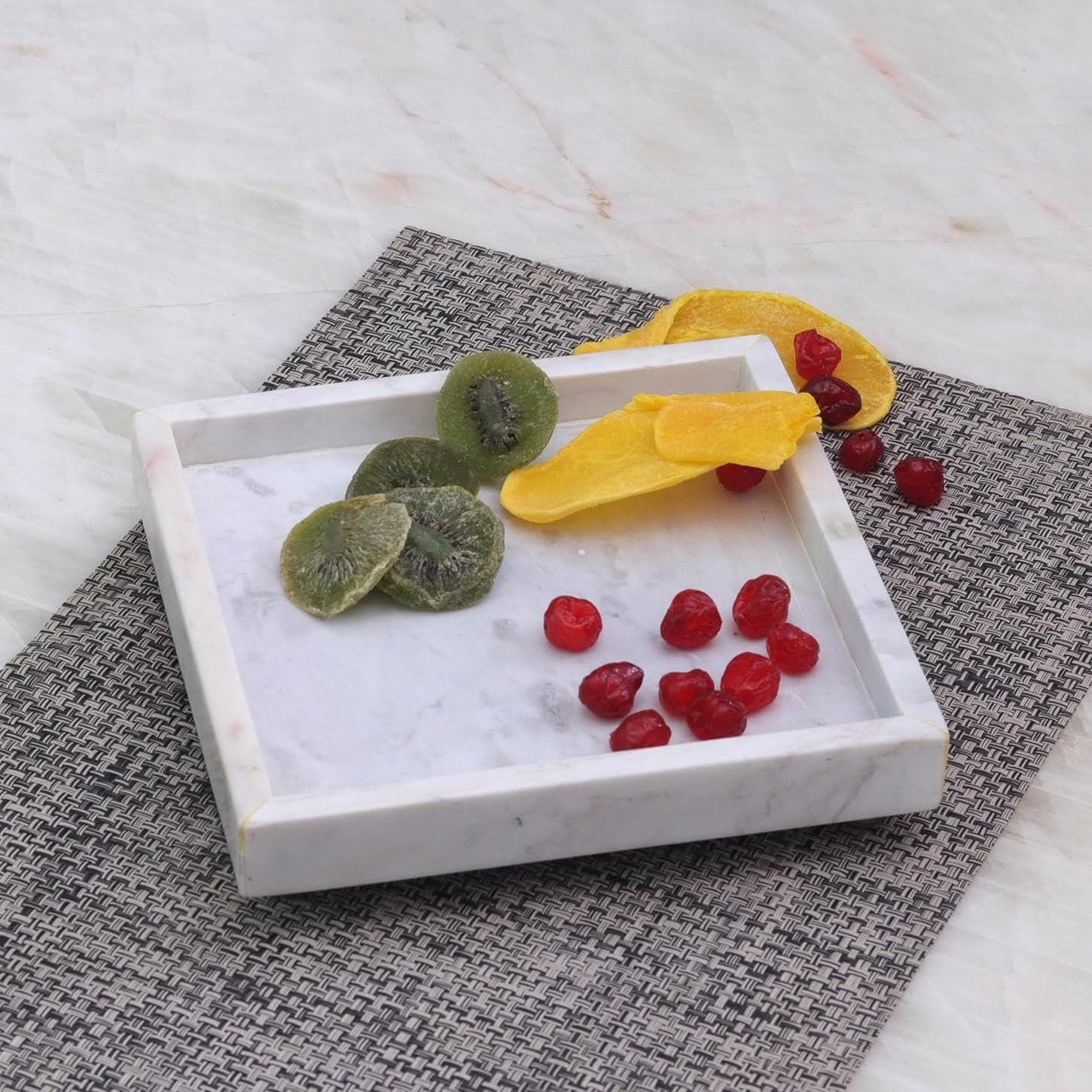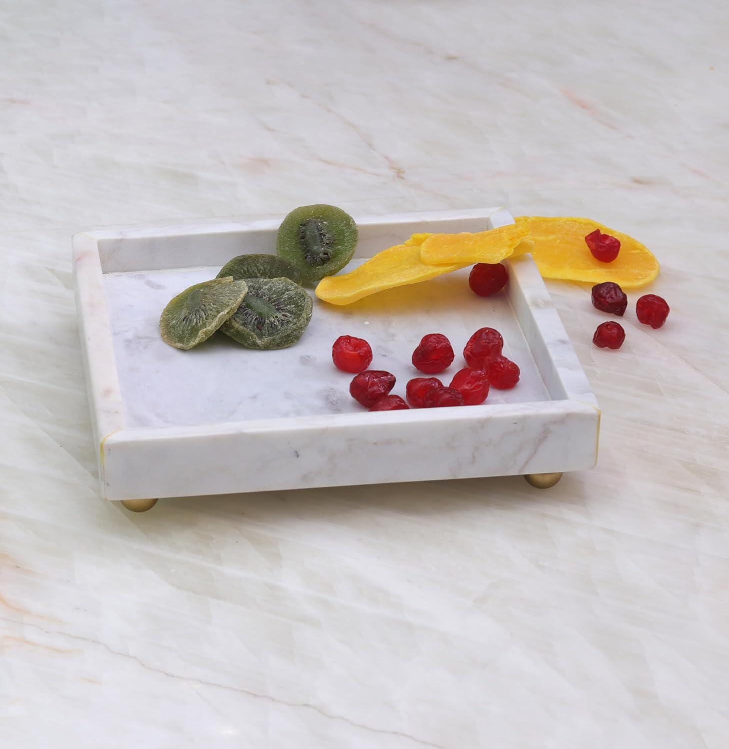 Add timeless elegance to your space with this Handmade White Marble Tray with Gold Feet, a refined blend of luxury design and everyday functionality. Crafted from premium natural white marble, this Square tray is elevated on small golden metal stands, giving it a floating, upscale look perfect for modern interiors.
