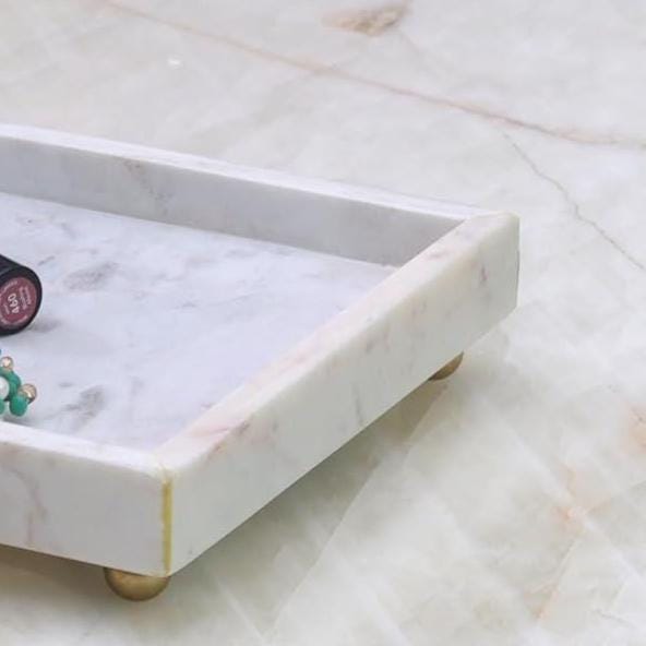Each tray is handcrafted, showcasing natural marble veining that makes every piece truly one of a kind. The raised gold feet not only enhance visual appeal but also protect surfaces from moisture, making it ideal for bathroom and vanity use.