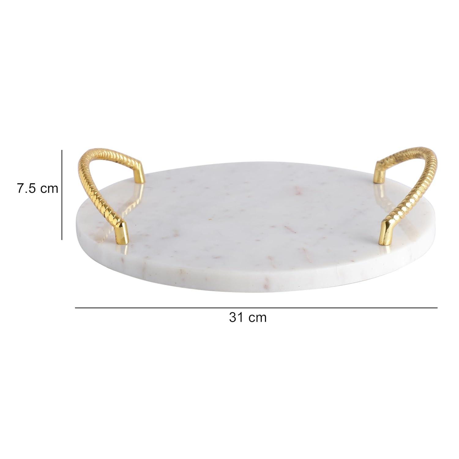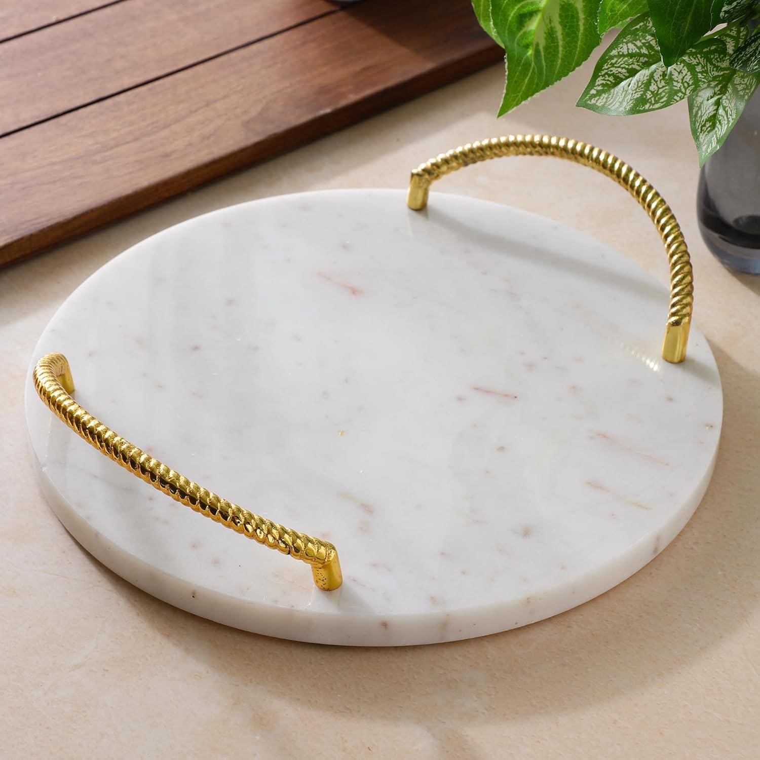 Handmade Round Marble Tray with Gold Finish Metal Handle – Luxury Serving & Vanity Tray, Decorative Home Centrepiece Gift Accessory
