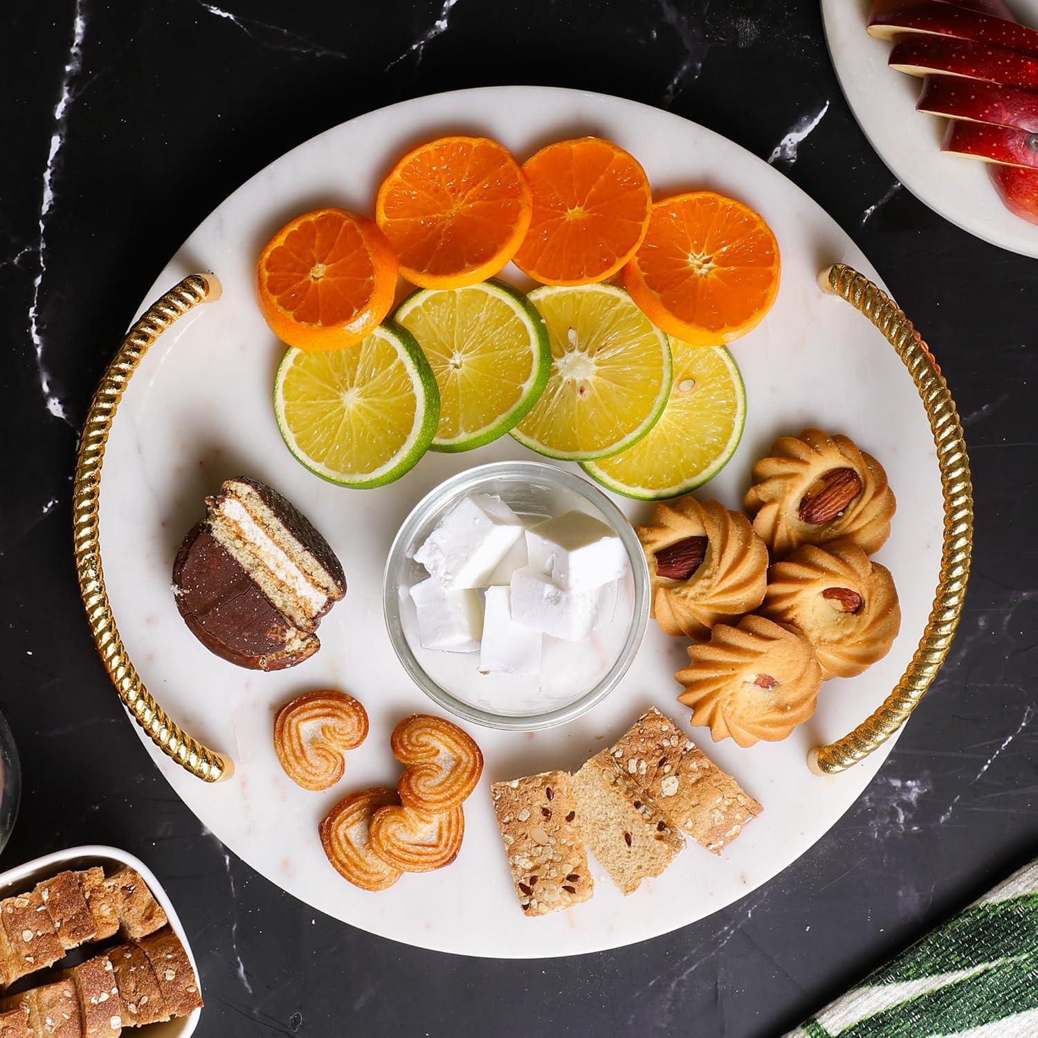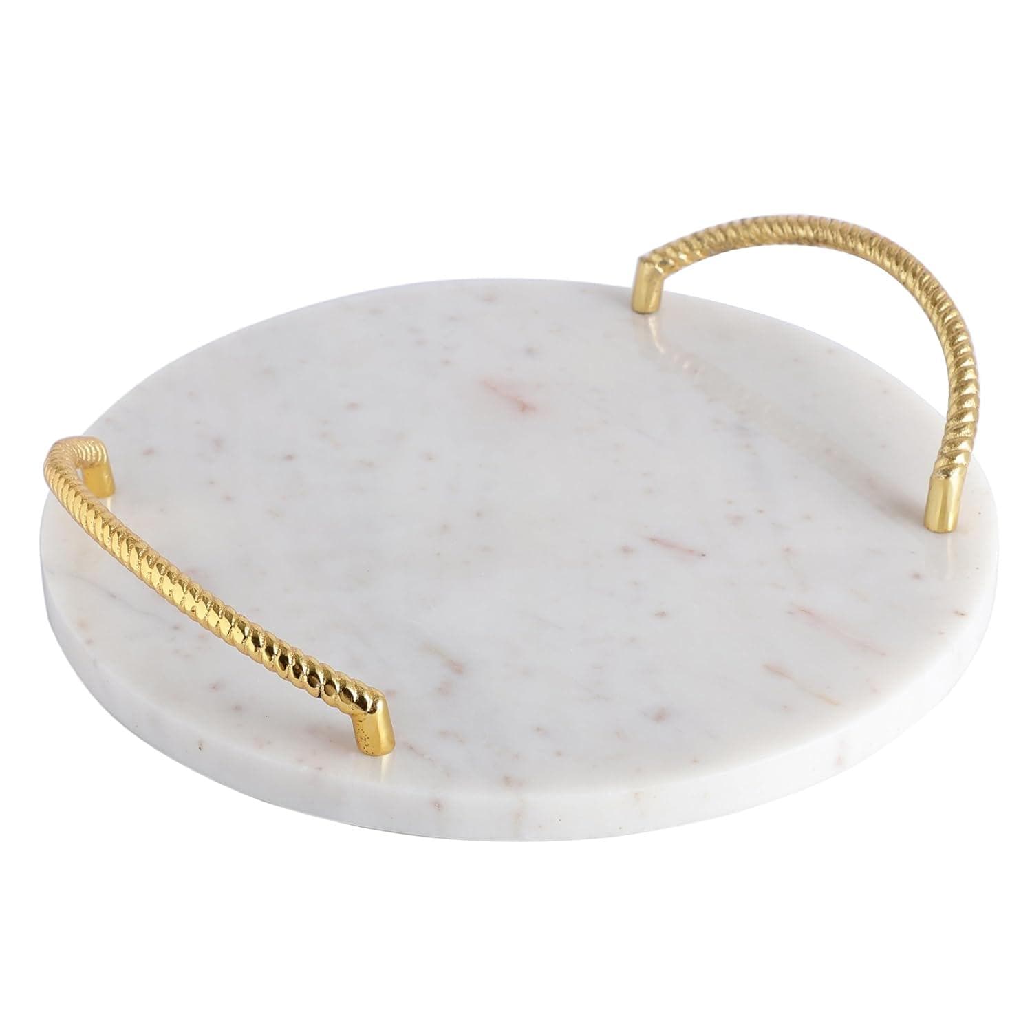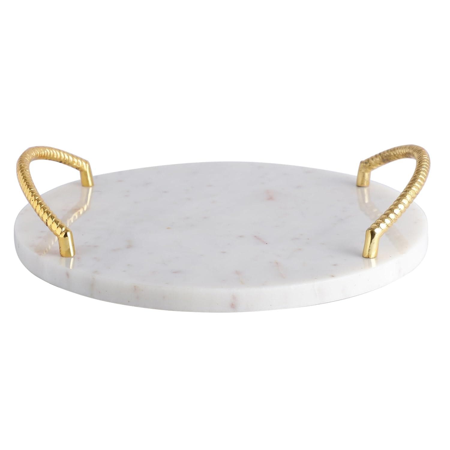Elevate your home décor and entertaining style with this Handmade Round Marble Tray featuring a Gold Finish Metal Handle — a stunning blend of natural elegance and utility. Crafted from premium marble with unique veining and paired with sleek gold-tone handles, this versatile tray adds a luxurious touch to any space.