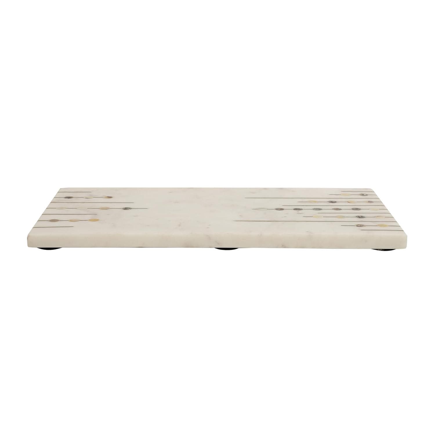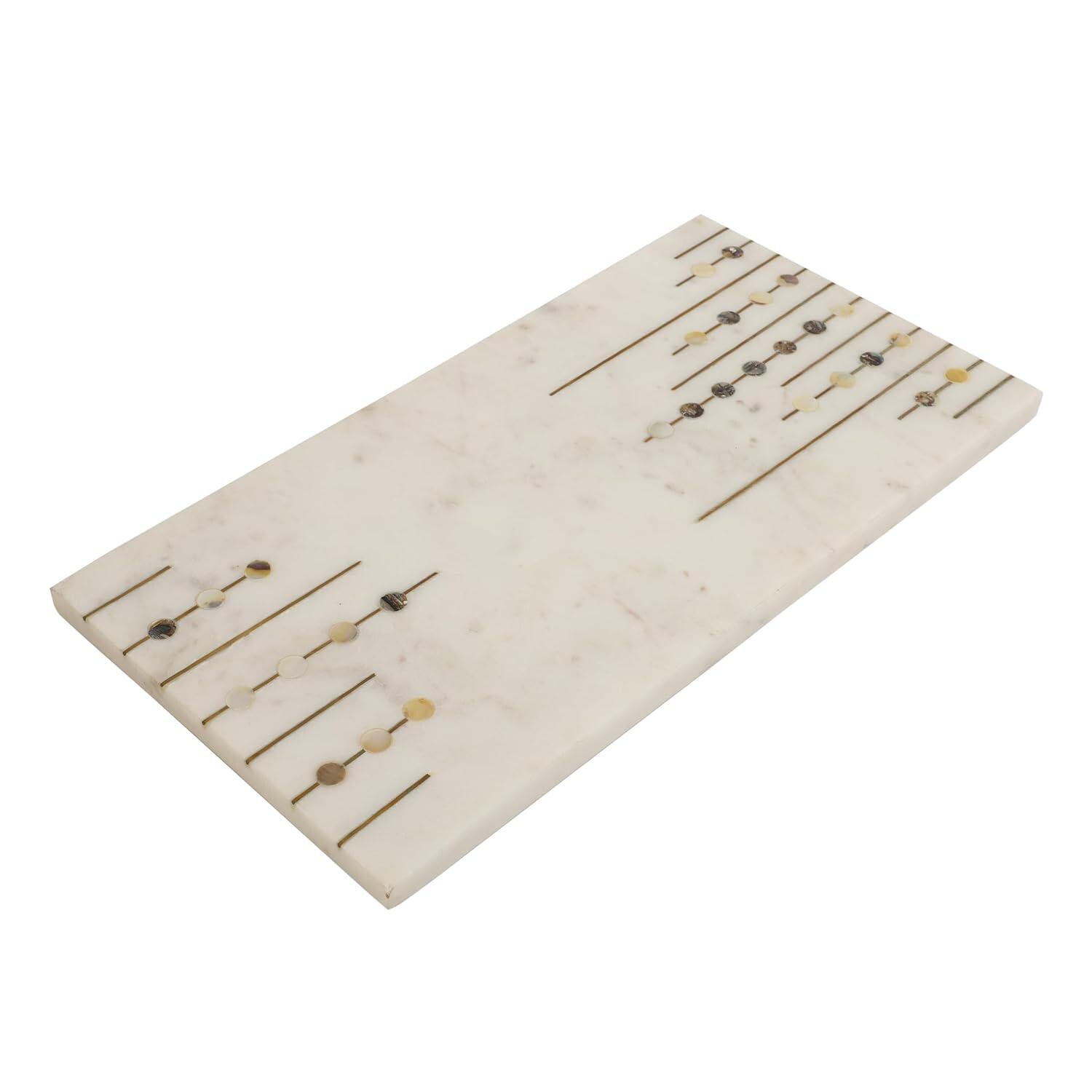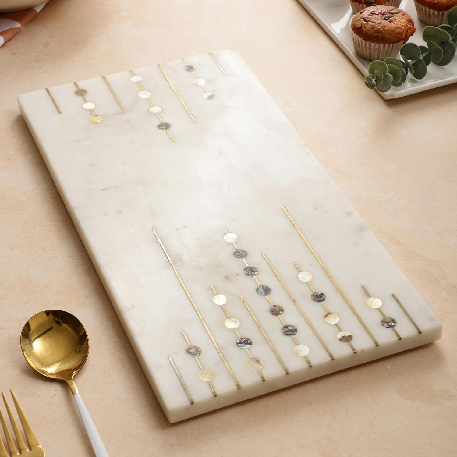 Perfect for serving cheeses, charcuterie, appetizers, fruits, desserts, or even as a decorative centerpiece, this elegant serving platter is both functional and beautiful. The abalone accents catch the light with iridescent hues, creating a captivating contrast against the smooth white marble surface. Whether you’re hosting a dinner party, gifting a treasured piece, or styling your kitchen décor, this artisanal board adds timeless sophistication.
