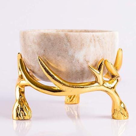 • Premium solid marble bowl — natural veining makes each piece unique • Metal antler‑style stand — adds rustic charm and stability • Perfect size for snacks, nuts, sweets, fruits, or décor • Works as table centerpiece or kitchen décor accent • Ideal as a hostess, housewarming, or artisan gift